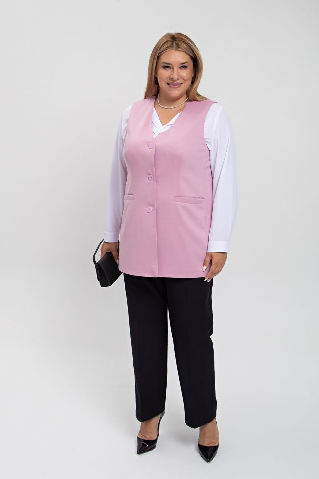 розовый Стильный удлиненный жилет полуприлегающего силуэта из трикотажной ткани на подкладке. Прилегание по груди за счет вытачек. Спинка со швом по центру. Модель с V-образным вырезом и центральной застежкой на петли и пуговицы.  По переду  удобные прорезные карманы с листочкой. Низ ровный. Жилет составит гармоничный комплект с блузкой арт:1394 и брюки 1228