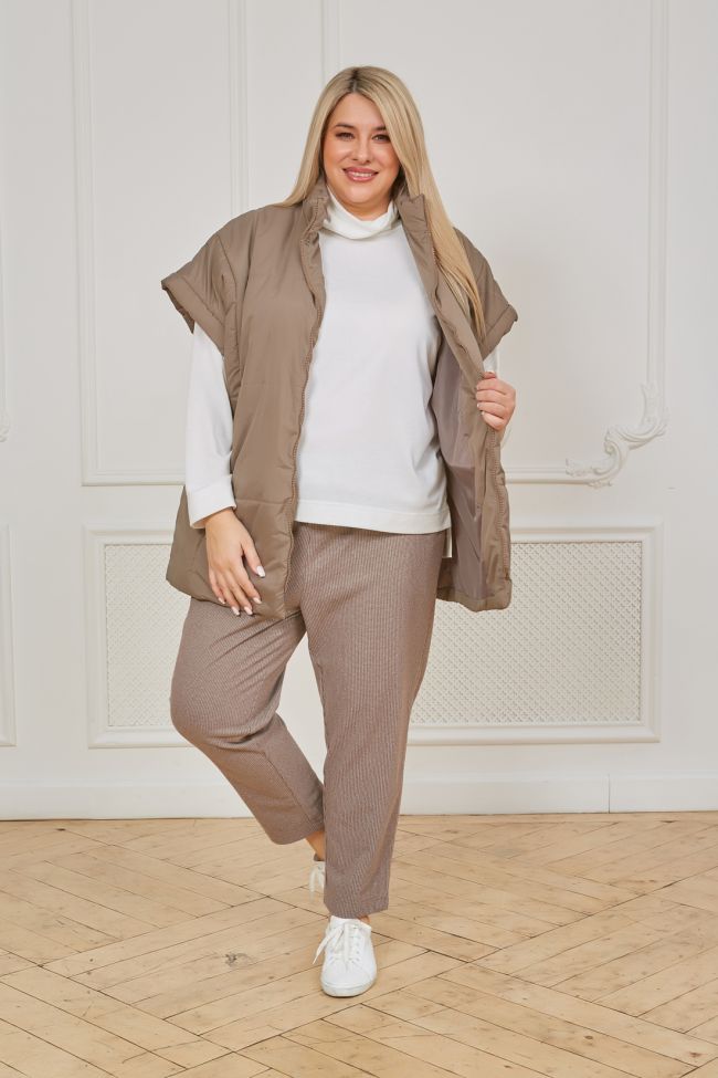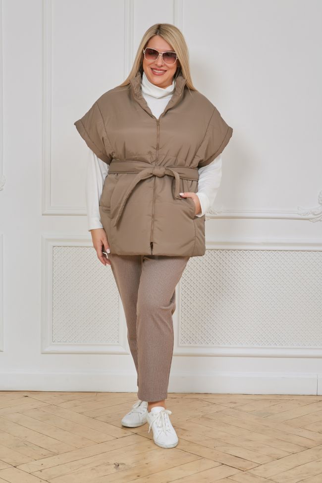 бежевый Стильный утепленный жилет прямого силуэта из плащевой ткани на синтепоне с крупной стежкой и подкладке. По переду и спинке вертикальные рельефы, в шве рельефов переда удобные карманы. Модель с круглым вырезом, дополненным воротником - стойка. Центральная застежка на молнию. Пройма оформлена притачной бейкой. Низ ровный. Модель укомплектована поясом.