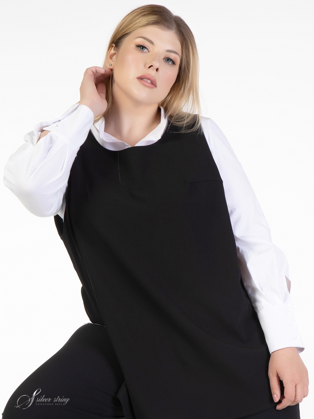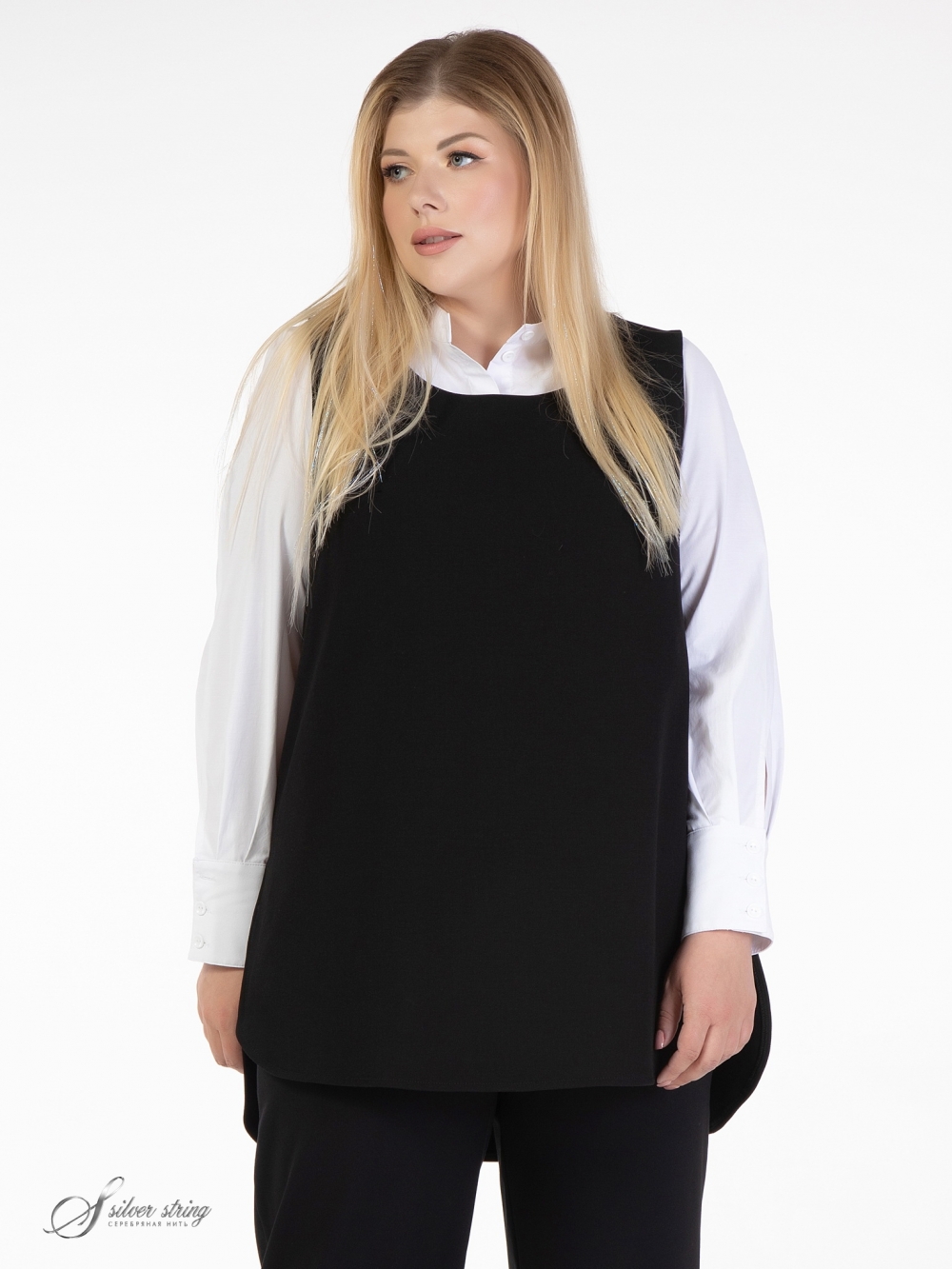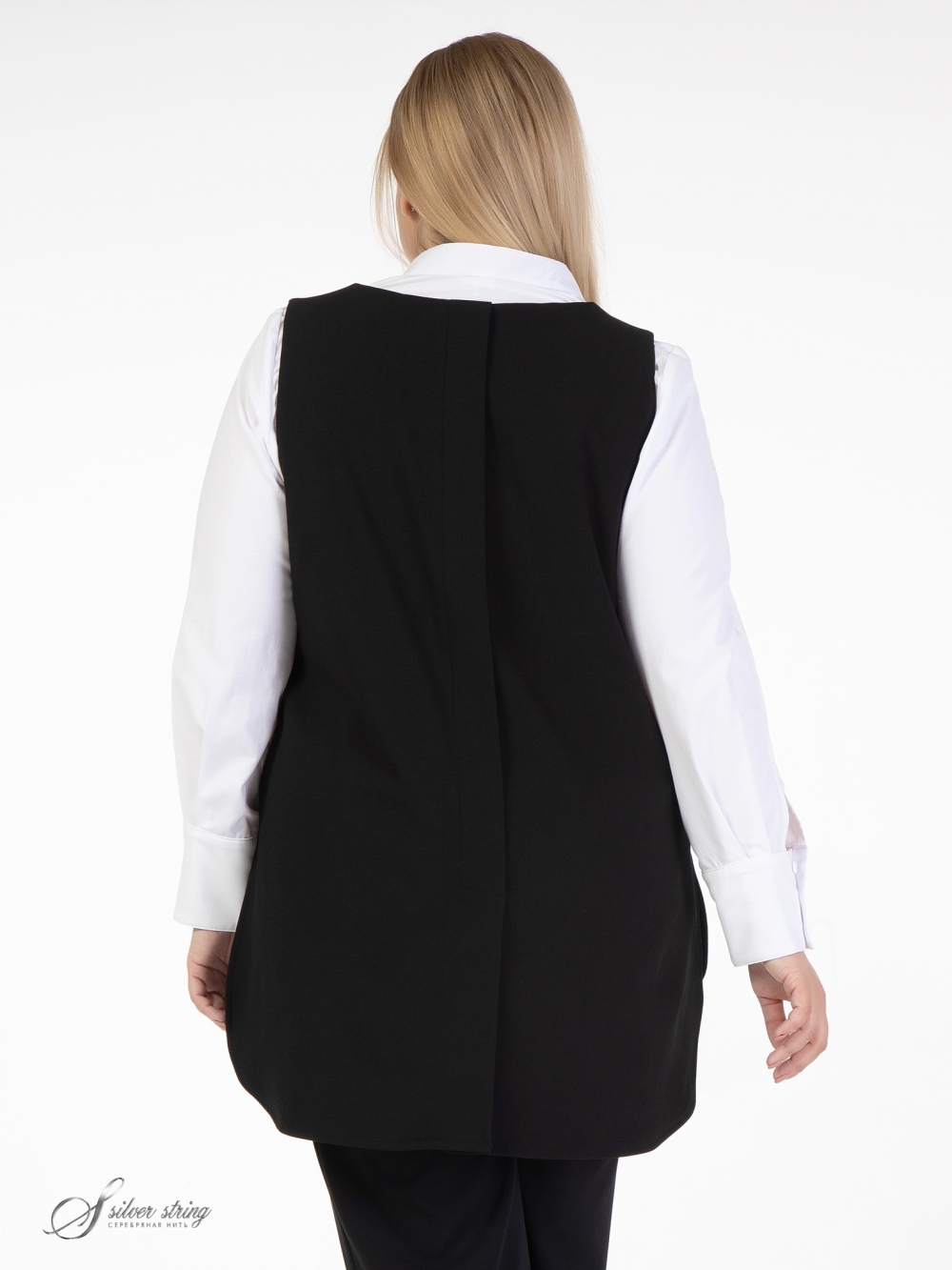 Модный жилет прямого силуэта выполнен из эластичной смесовой ткани с высоким содержанием натурального волокна. Модель без застежки, с округлой линией горловины и углубленной проймой. На спинке заложена глубокая вертикальная складка, переходящая в шлицу. Низ изделия оформлен асимметрично, спинка удлинена относительно полочки. В боковых швах обработаны разрезы скругленной формы. Такой крой отлично маскирует проблемные зоны, стройнит и вытягивает фигуру. Это оригинальная модель, которая прекрасно впишется в Ваш гардероб и станет незаменимой при создании разнообразных комплектов.