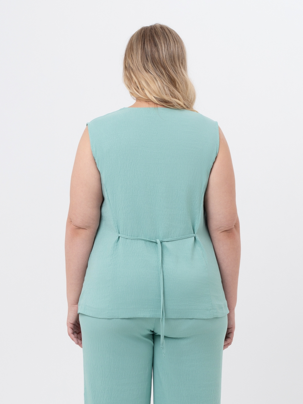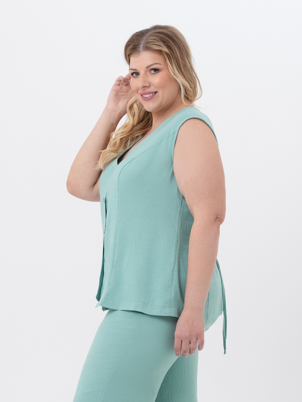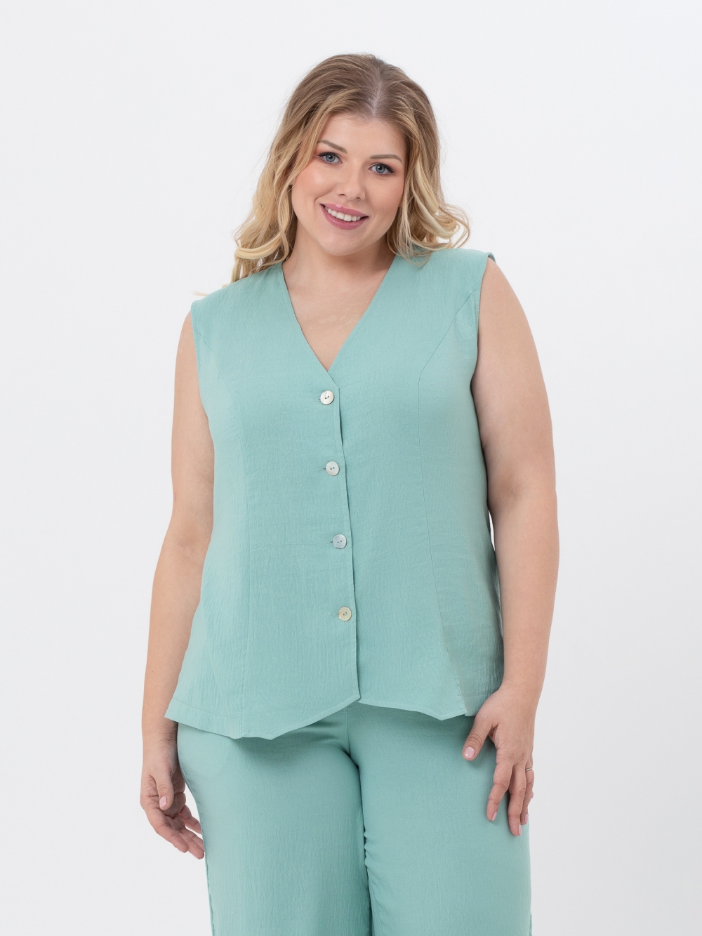Модный жилет полуприлегающего силуэта выполнен из однотонной «крэшированной» вискозной ткани с добавлением эластана. Углубленный V-образный вырез горловины вытягивает зону декольте. По борту обработана застежка на пуговицы. Для лучшей посадки на фигуре, на спинке предусмотрен тонкий шнур-завязка. Ментоловый оттенок, в котором выполнена модель, является фаворитом сезона. Такие тона можно использовать не только в одежде, но и в аксессуарах. Жилет отлично подойдет в качестве блузы-топа - т.к. прекрасно сочетается с различными жакетами, кардиганами и блузонами. Этот идеальный выбор для создания стильных комплектов с брюками-палаццо