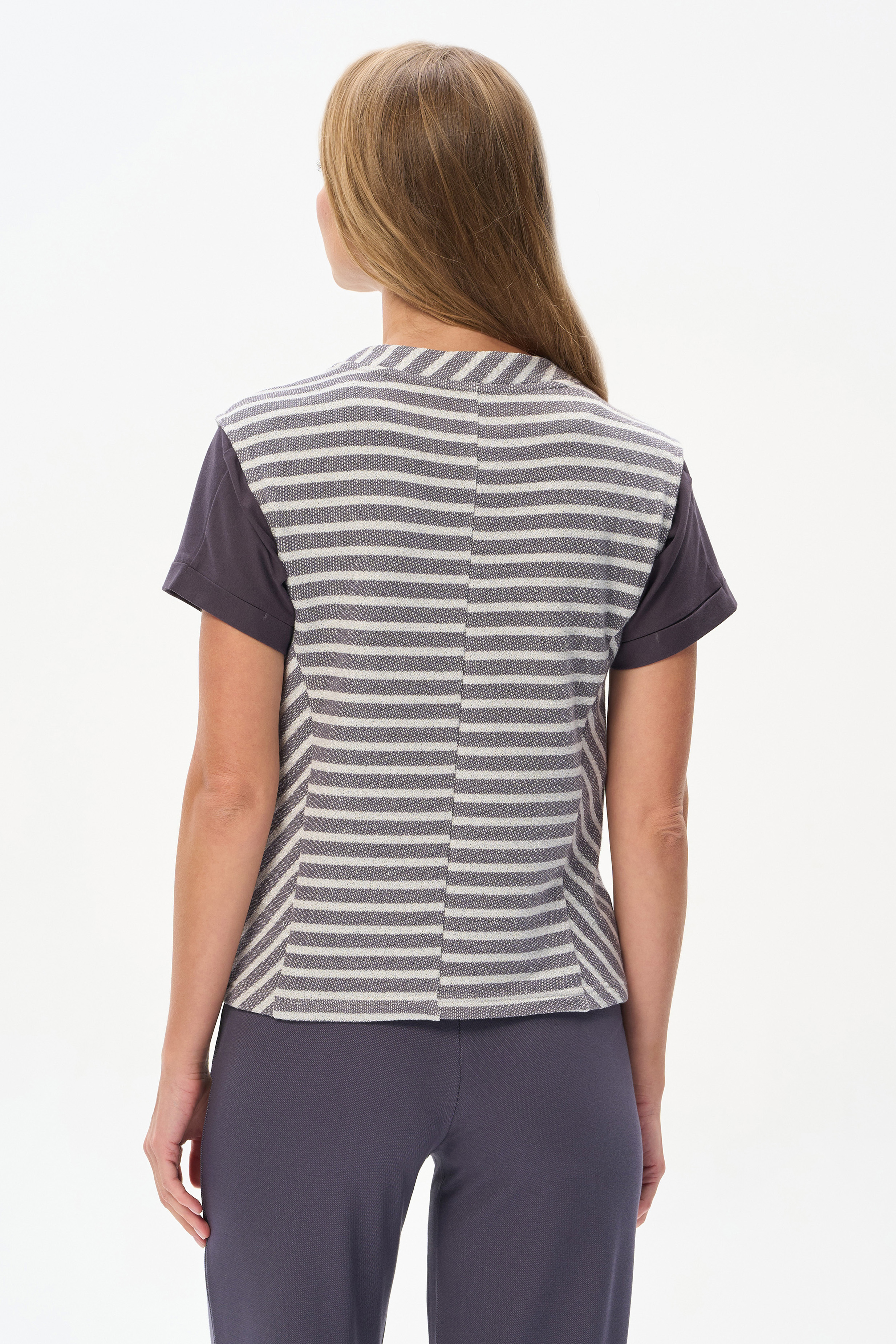 Жилет из фактурного жаккарда в полоску в оттенках коллекции 200 гр. Игра полос и декоративные строчки - эффектные особенности модели. Стильно смотрится как поверх футболок, так и самостоятельно. Рост модели 175 см.