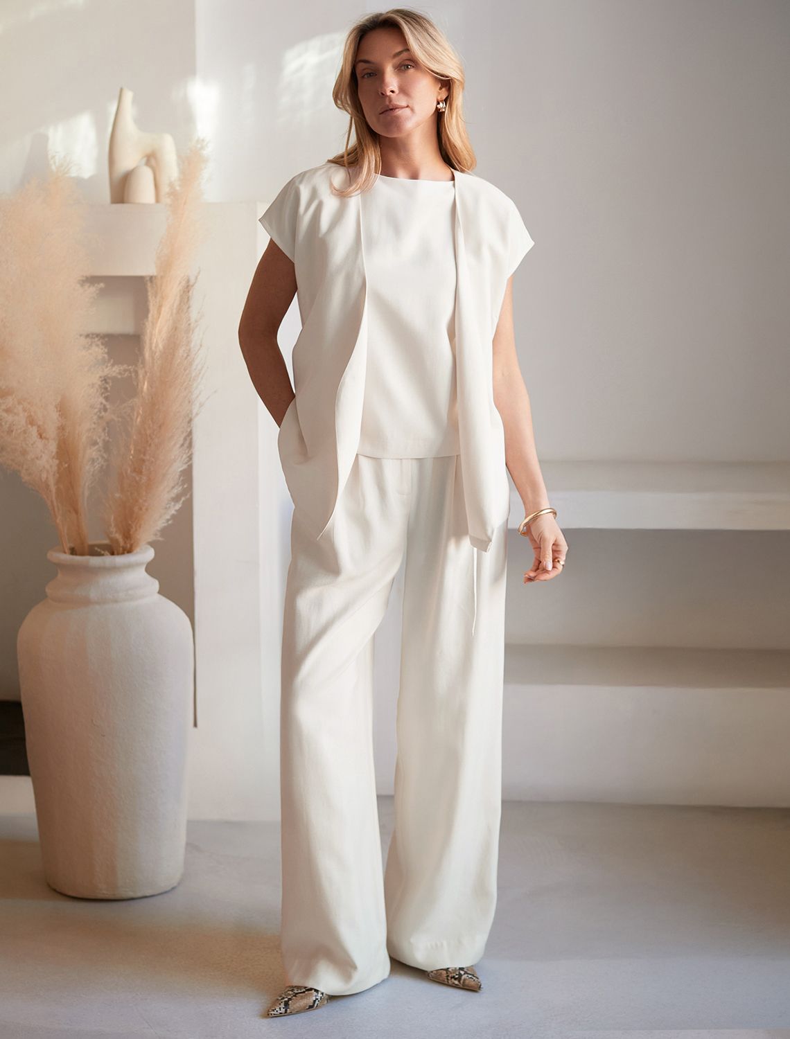 Жилет натурального белого цвета выполнен из плотного лиоцелла. Лиоцелл это более дорогой и экологичный вариант вискозы, очень прочный и шелковистый. Ткань отличается от регулярной коллекции из лиоцелла - она содержит еще больше лиоцелла (92%), благодаря чему имеет более нежную шелковистую фактуру. Стильный фасон и легкий материал делают эту жилетку идеальным вариантом для весны и лета. Пояс мягко акцентирует талию, красиво облегает силуэт и корректирует пропорции, а V-вырез изящно подчеркивает линию шеи. Жилет можно носить без пояса, создавая расслабленный образ. Спущенная линия плеча позволяет использовать жилет, где требуется деловой дресс-код. Благодаря продуманному крою жилетка сидит идеально на разных фигурах, в том числе и на больших размерах..Такой жилет помогает создать актуальный и функциональный летний гардероб: он превосходно сочетается с разными низами, мгновенно преображая любой аутфит. Комплект из лиоцелла подчеркнет ваш вкус и статус. Это идеальный выбор для особенных моментов. Такой образ будет уместен на торжественных мероприятиях и приемах, выпускных вечерах, семейных праздниках и свадьбах.