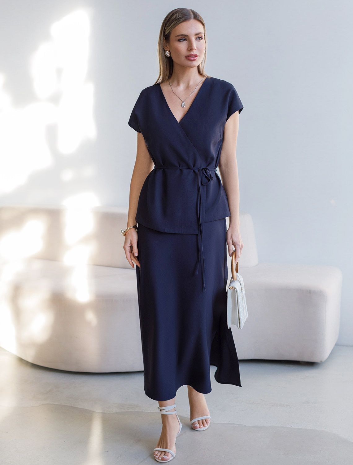 Жилет темно-синего цвета выполнен из плотного лиоцелла.Лиоцелл это более дорогой и экологичный вариант вискозы, очень прочный и шелковистый. Ткань отличается от регулярной коллекции из лиоцелла - она содержит еще больше лиоцелла (92%), благодаря чему имеет более нежную шелковистую фактуру. Стильный фасон и легкий материал делают эту жилетку идеальным вариантом для весны и лета. Пояс мягко акцентирует талию, красиво облегает силуэт и корректирует пропорции, а V-вырез изящно подчеркивает линию шеи. Жилет можно носить без пояса, создавая расслабленный образ. Спущенная линия плеча позволяет использовать жилет, где требуется деловой дресс-код. Благодаря продуманному крою жилетка сидит идеально на разных фигурах, в том числе и на больших размерах..Такой жилет помогает создать актуальный и функциональный летний гардероб: он превосходно сочетается с разными низами, мгновенно преображая любой аутфит. Комплект из лиоцелла подчеркнет ваш вкус и статус. Это идеальный выбор для особенных моментов. Такой образ будет уместен на торжественных мероприятиях и приемах, выпускных вечерах, семейных праздниках и свадьбах.