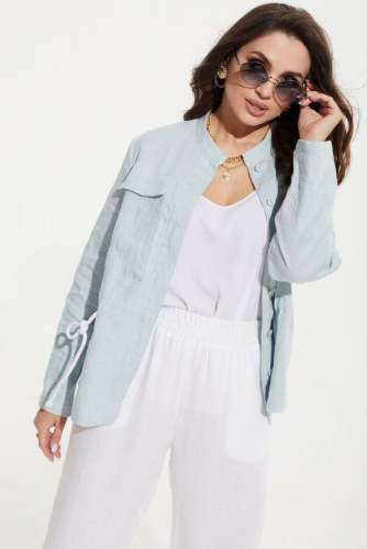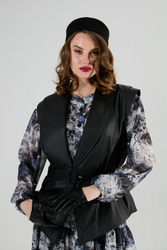 Жилет удлиненный свободного прямого силуэта, воротник пиджачного типа. Линия низа по переду и спинке фигурная ассиметричная. Короткий рукав-крылышко. Талия фиксируется съемным ремнем из экокожи, для которого в боковых швах оформлены шлевки. Ремень идёт в комплекте к изделию.