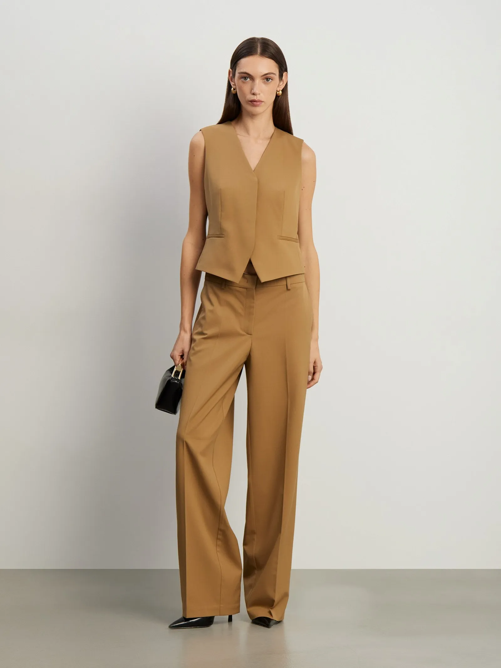 Модный жилет без лацканов с потайными пуговицами. Плотный материал в бежевом цвете почти наполовину состоит из шерсти. Модель приталенного кроя имеет фигурную линию борта и дополнена стильными узкими карманами с листочкой. Завершить образ можно элегантными брюками или юбкой, а также жакетом из комплекта. Изделие изготовлено на подкладке.