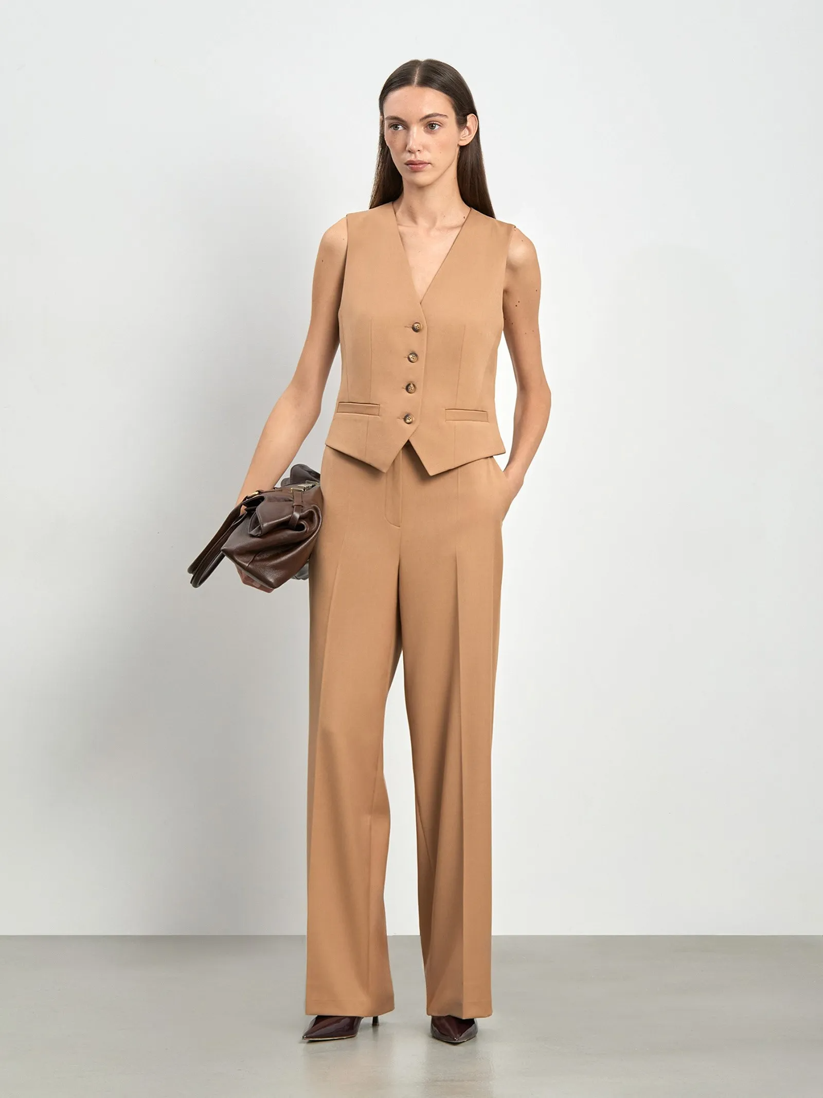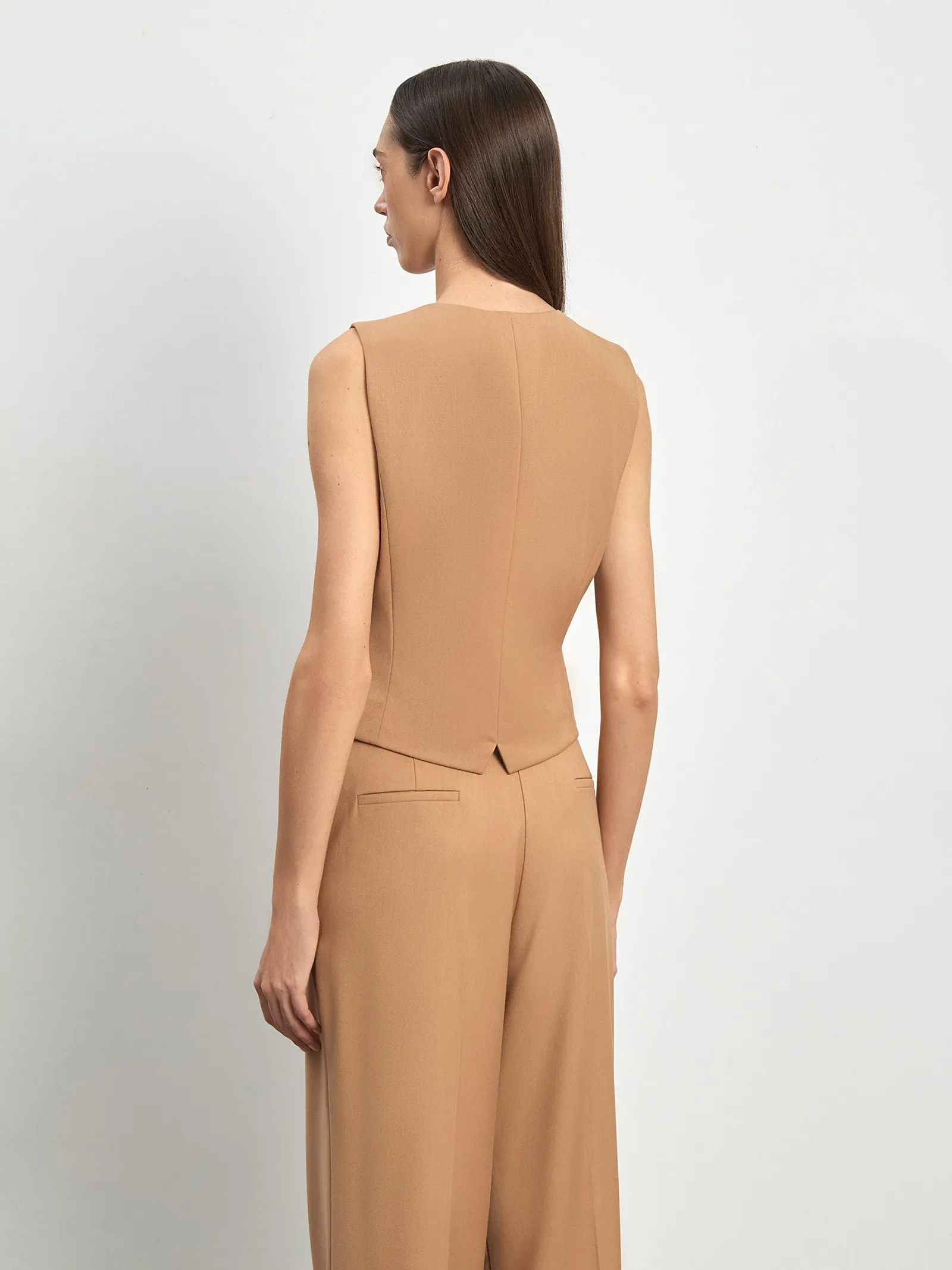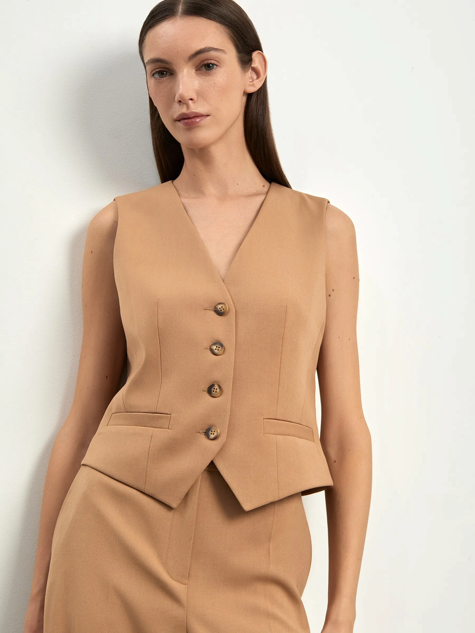 Жилет в бежевом цвете для стильных деловых и кэжуальных образов. Модель приталенного кроя имеет фигурную линию борта и карманы с листочками. Застёгивается на ряд пуговиц. Завершить образ можно брюками и жакетом из комплекта. Изделие выполнено на подкладке.