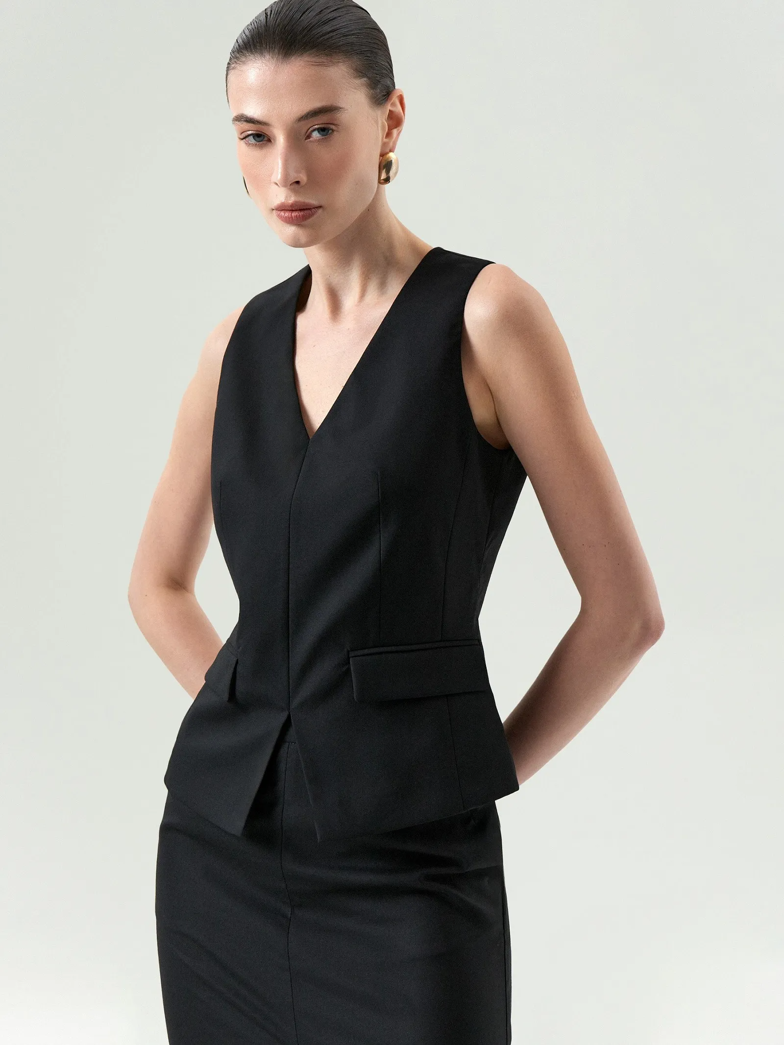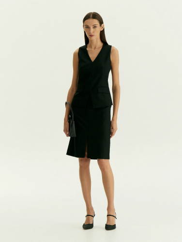 Приталенный жилет создаёт стильный и современный образ на каждый день. V-вырез поддерживается остроугольным разрезом внизу, прямоугольные клапаны дополняют интересную геометрию вещи. Модель стройнит, изящно смотрится на фигуре. Тонкий, но тёплый костюмный материал на четверть состоит из шерсти, выполнен с содержанием вискозы и добавлением эластана. Это идеальный вариант на демисезон и не только. Жилет застёгивается сзади на удобную молнию. Выполнен на подкладке с высоким содержанием вискозы. Завершить образ с ним можно брюками из комплекта.