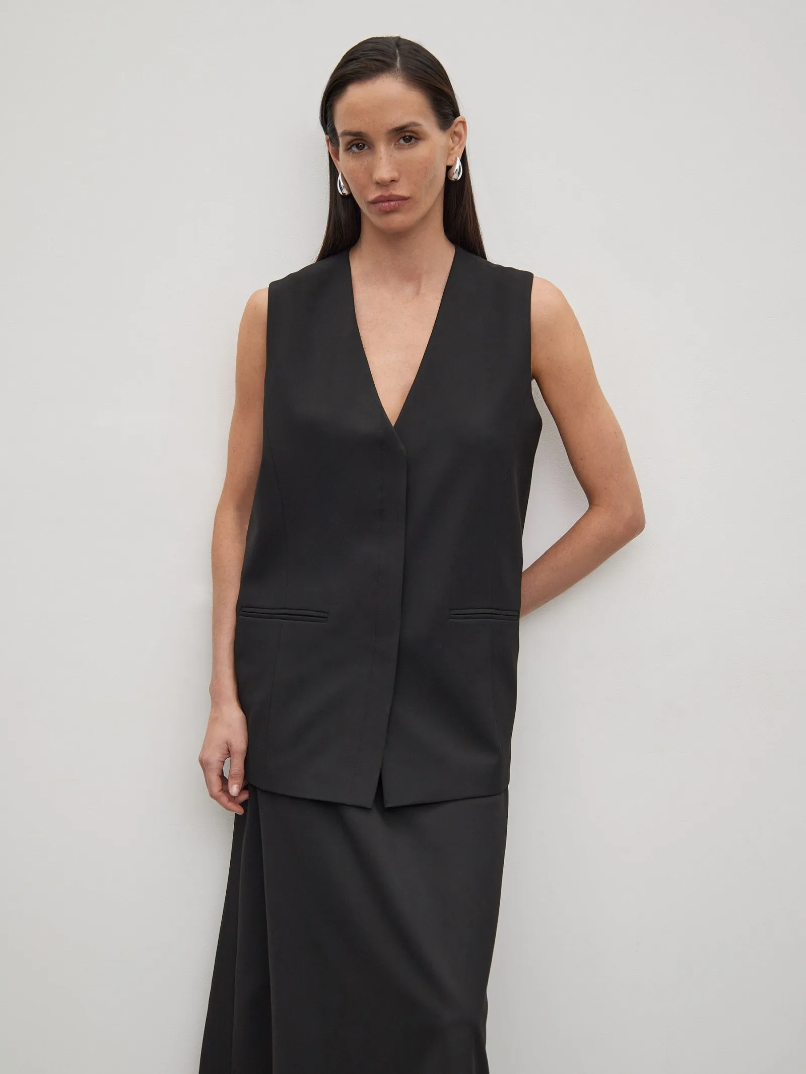 Универсальный чёрный жилет для работы, повседневных и торжественных образов. Элегантная удлинённая модель прямого кроя застёгивается на ряд пуговиц, скрытых планкой. Дополнена изящными узкими карманами с листочкой. Жилет отлично подойдёт для многослойных образов и интересно смотрится соло, на голое тело. Сочетается с любыми базовыми водолазками и рубашками в гардеробе.
