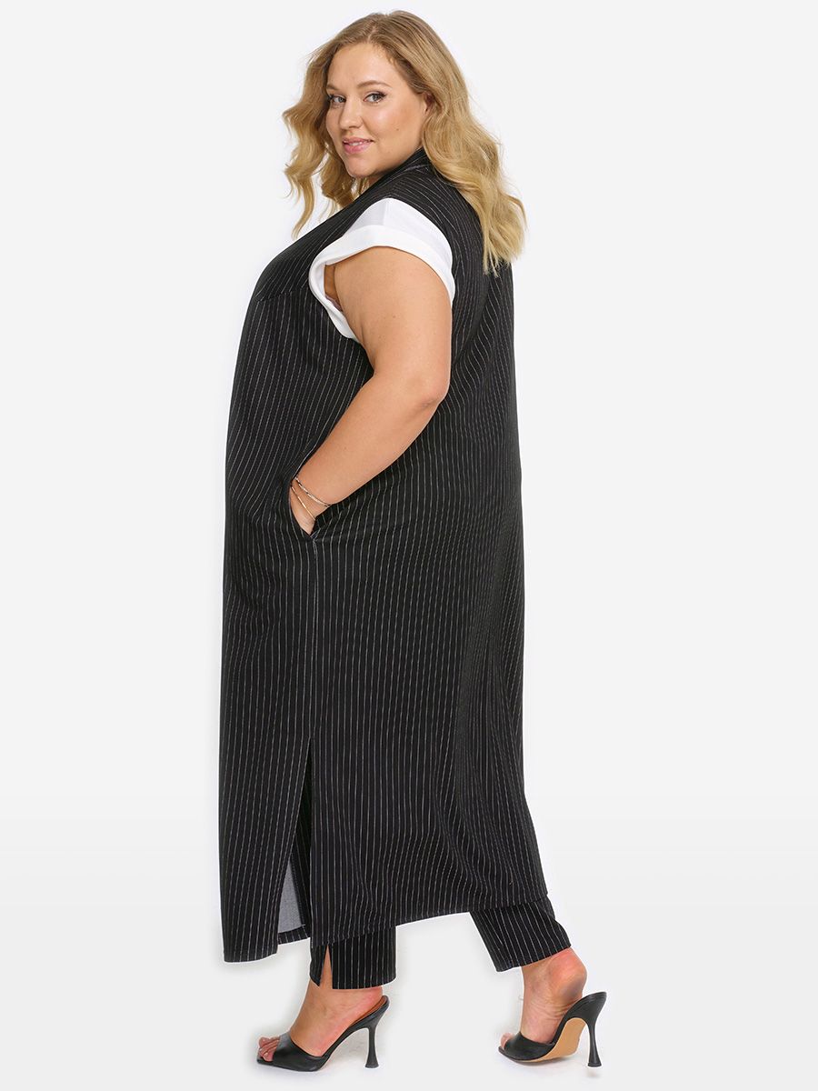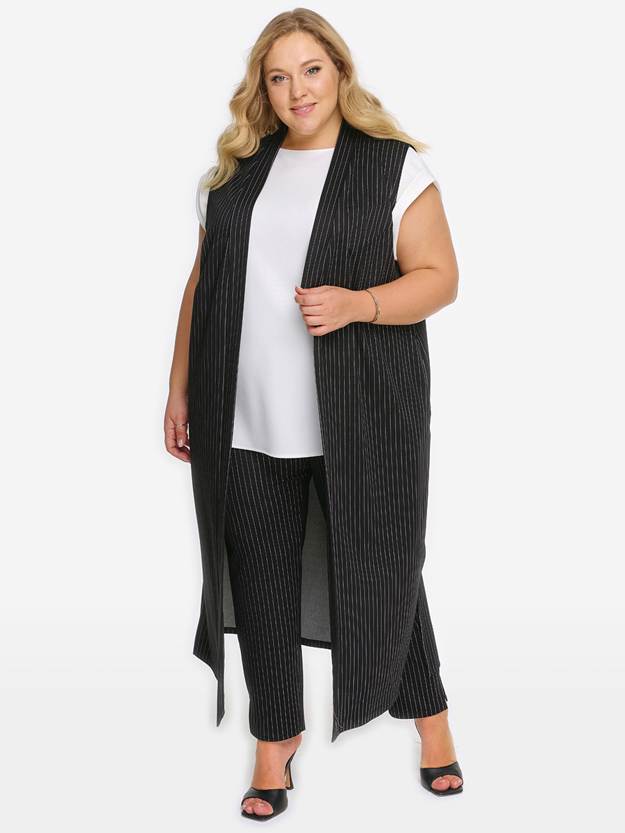 Удлиненный, стильный  жилет из плотного черного джерси в полосочку.  В боковых швах карманы и разрезы.  В нем вам будет комфортно и на прогулках и в офисе.