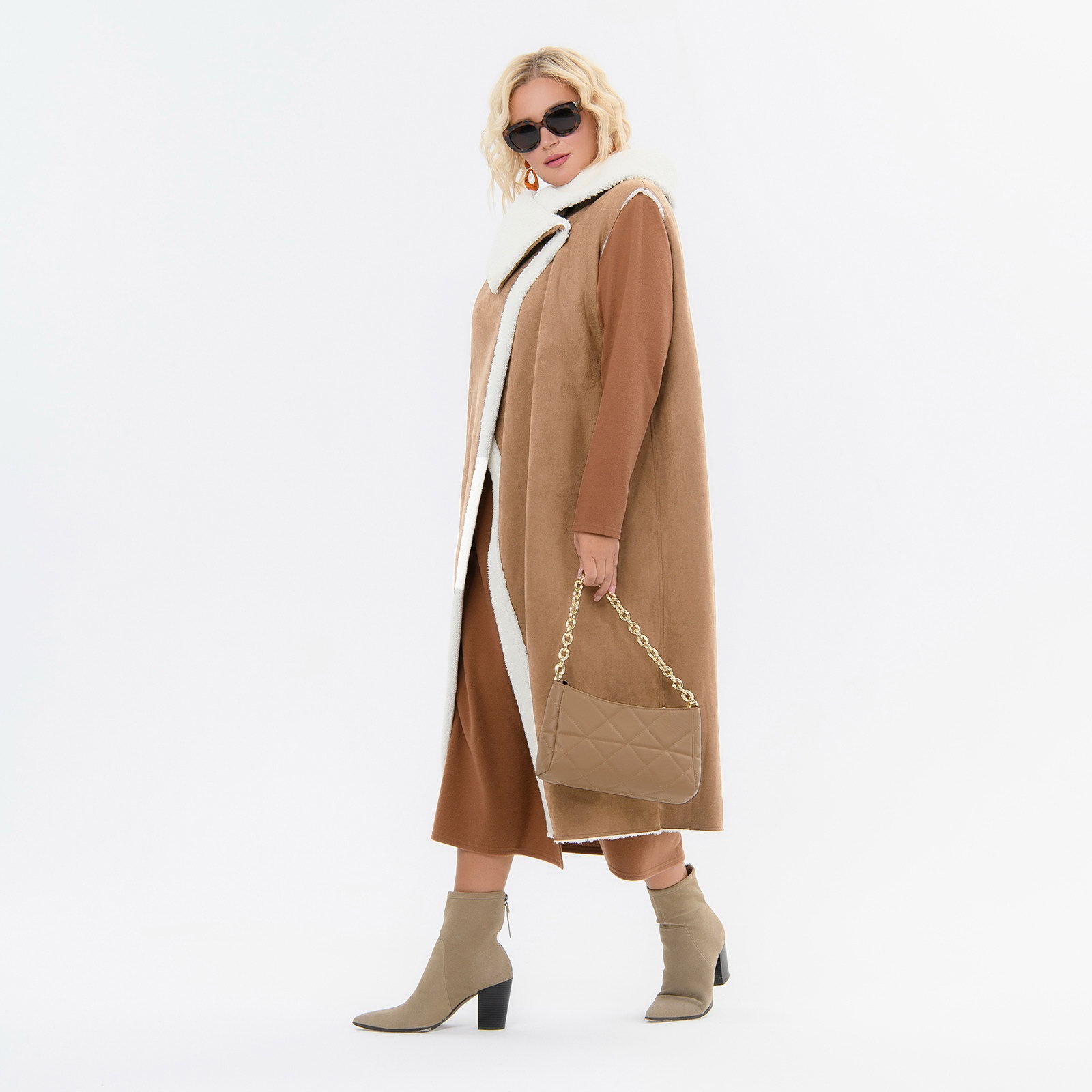 Жилет удлиненный из экомеха "дубленка", с косой линией борта, цвет "карамель"