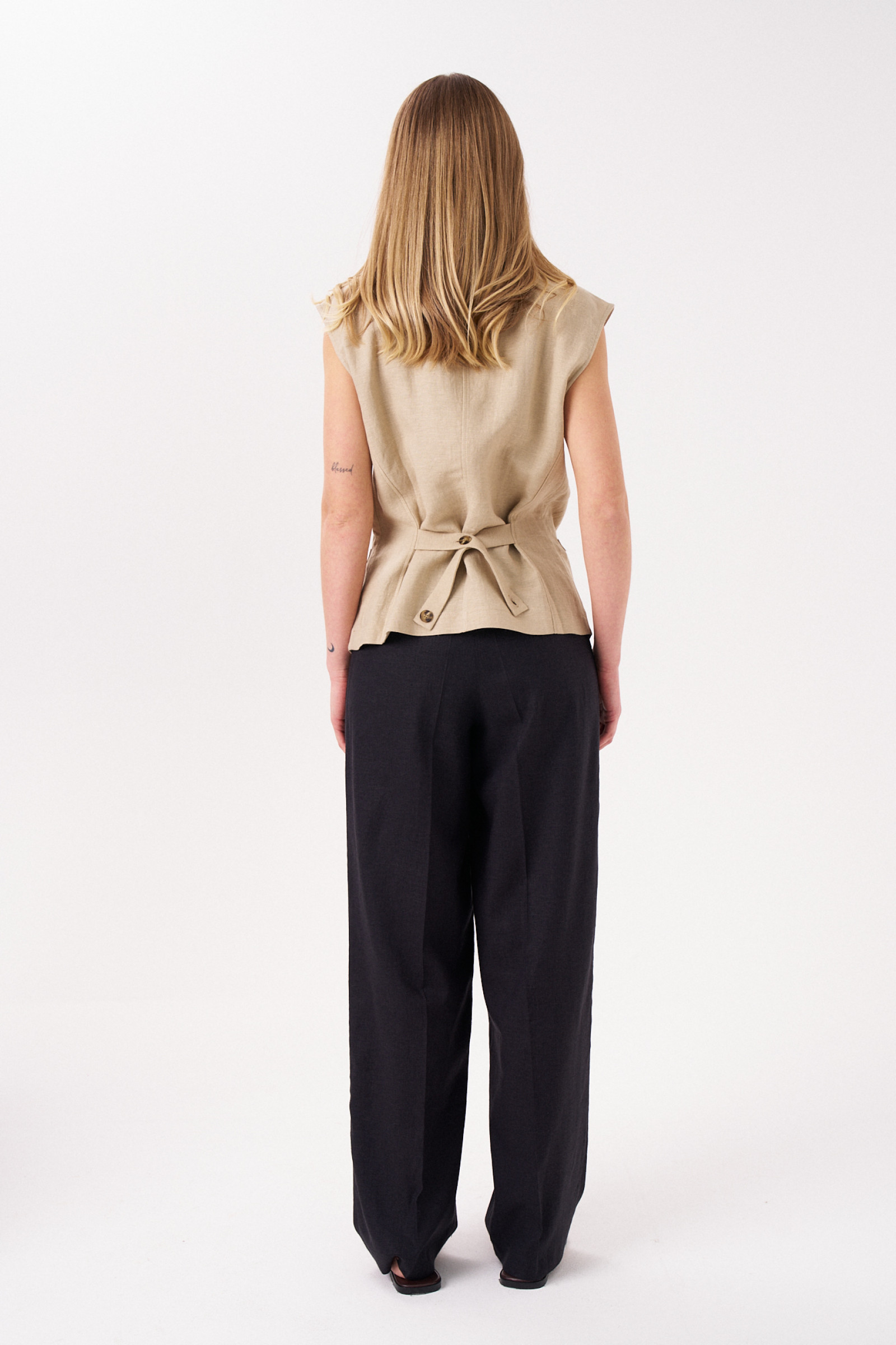 Жилет женский полуприлегающего силуэта из льняной ткани для повседневной носки. Жилет однобортный застегивающийся на пуговицы. По переду нагрудные вытачки и прорезные карманы" в рамку". По спинке пояс для регулировки посадки. Длина изделия классическая.