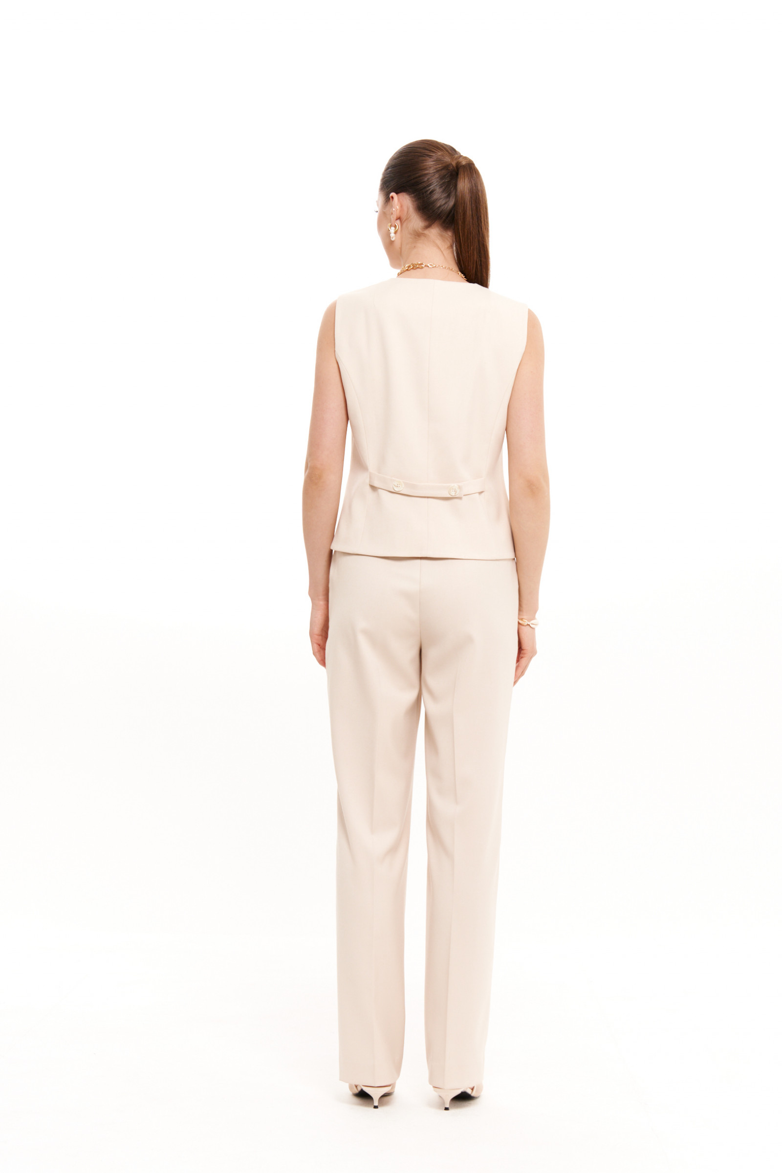 Жилет женский из поливискозной ткани для повседневной носки. Жилет полуприлегающего силуэта. Застежка центральная бортовая на обметанные петли и пуговицы. Перед имеет два рельефа идущих от проймы до линии низа, а также две талиевые вытачки и два прорезных кармана в рамку с двумя обтачками. Спинка со средним швом и двумя рельефами, идущими от проймы до линии низа, а также по спинке имеется две плечевые вытачки. По спинке располагается декоративный хлястик. Горловина обработана пиджачным воротником. Жилет без рукавов. Жилет на подкладке. Стильная жилетка, в которой вы безусловно будете чувствовать себя превосходно.