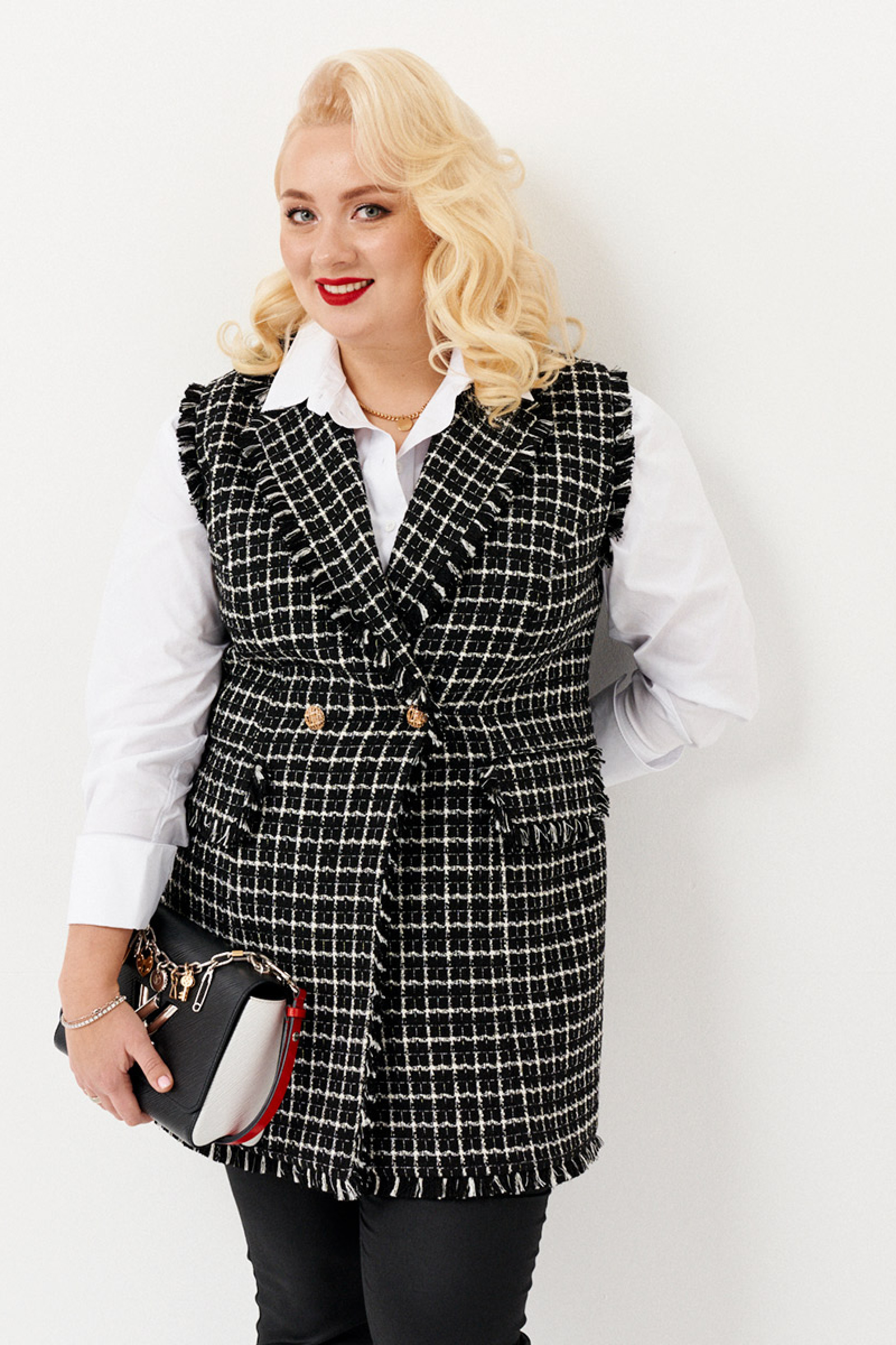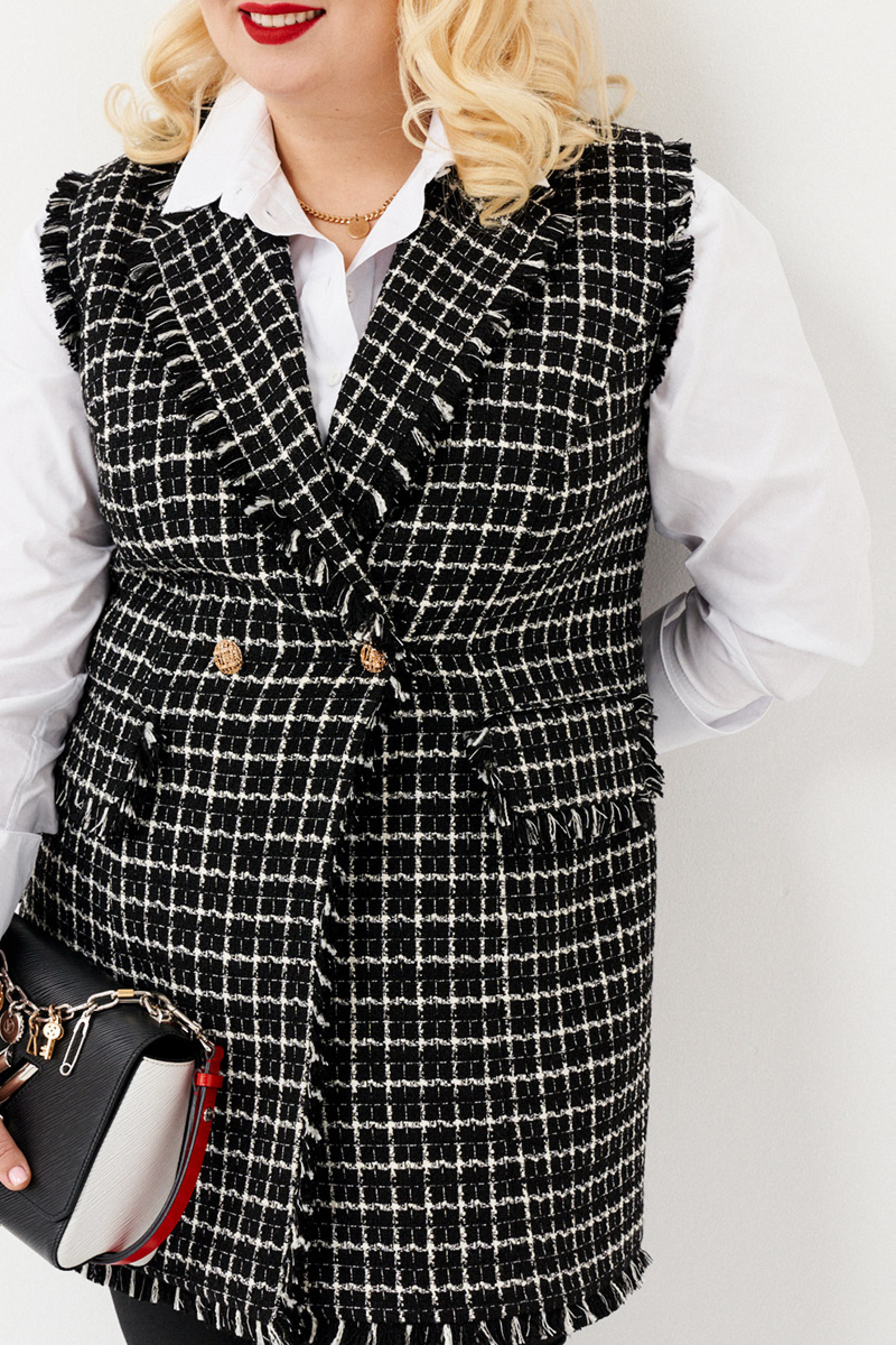 Стильная жилетка полуприлегающего силуэта бренда Ketty из твидовой ткани в клетку. Жилетка, удлиненная с английским воротником. Перед дополнен двумя прорезными карманами с клапанами. Клапаны дополнены бахромой из основной ткани. По низу жилетки, воротнику и по проймам имеется отделка бахрома из основной ткани. Изделие на подкладке. Такая жилетка отлично сочетается с различными джемперами или рубашками, создавая стильный образ. Модель построена на сочетании черного и белого цветов в расслабленном стиле создает современный образ в сочетании с джинсами, футболками, костюмными палаццо и юбками. Для этого жилета характерна женственность, утонченность и комфорт - модель идеально дополнит повседневные и праздничные образы.