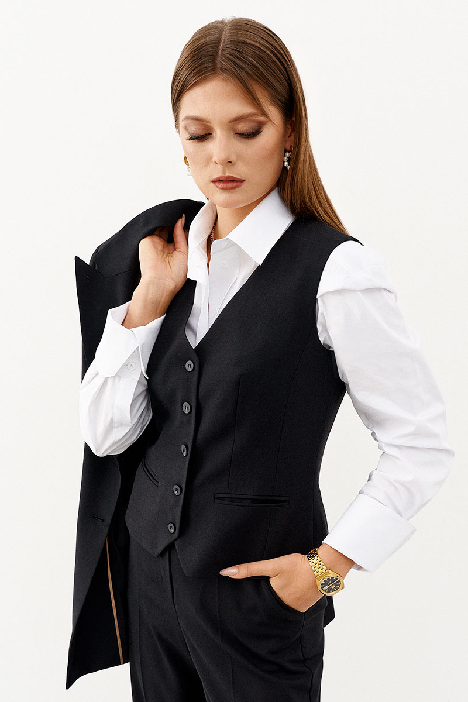 Жилет женский в классическом стиле бренда Ketty - современная база женского гардероба. Классический жилет выполнен из костюмной ткани с V-образным вырезом, полуприлегающего кроя, подходит для образов в офис, в университет, в школу, на каждый день. Жилетка короткая на пуговицах имеет подклад из вискозы, ее можно надевать под пиджак как первый слой (тренд сезона), под кардиган, а также сочетать с шелковыми топами, блузками женскими, водолазками, рубашками. Дополни жилеткой классическую прямую юбку, юбку мини, женские прямые брюки или брюки палаццо и даже джинсы!