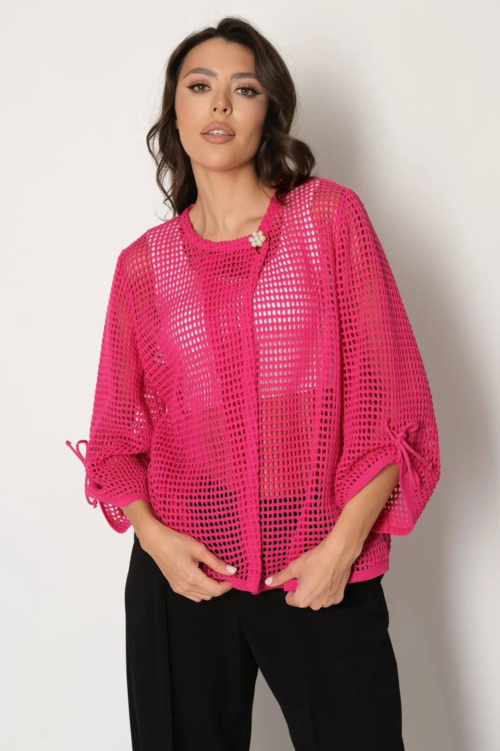 Жакет выполнен ажурной сеткой из смесовой пряжи с натуральным хлопком. Горловина круглая, рукава втачные длиной 7/8. Жакет застёгивается на одну пуговицу на горловине, вторая пуговица потайная расположена симметрично на передней планке изделия. Жакет можно носить в тёплое время года вторым слоем на топы, блузы, майки. ягодный