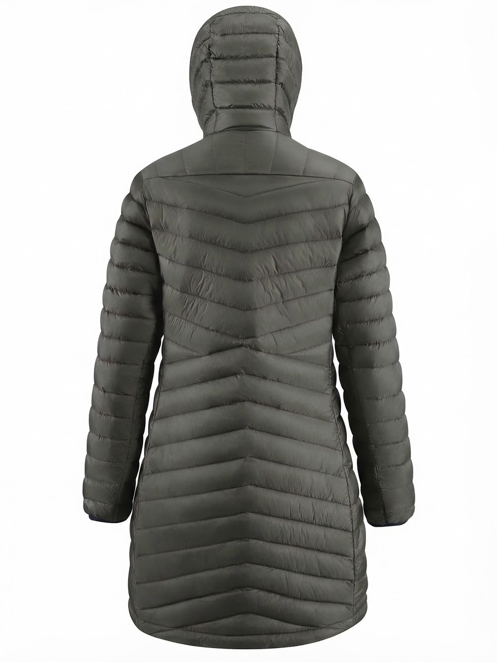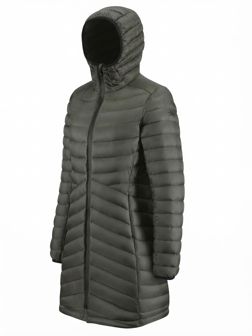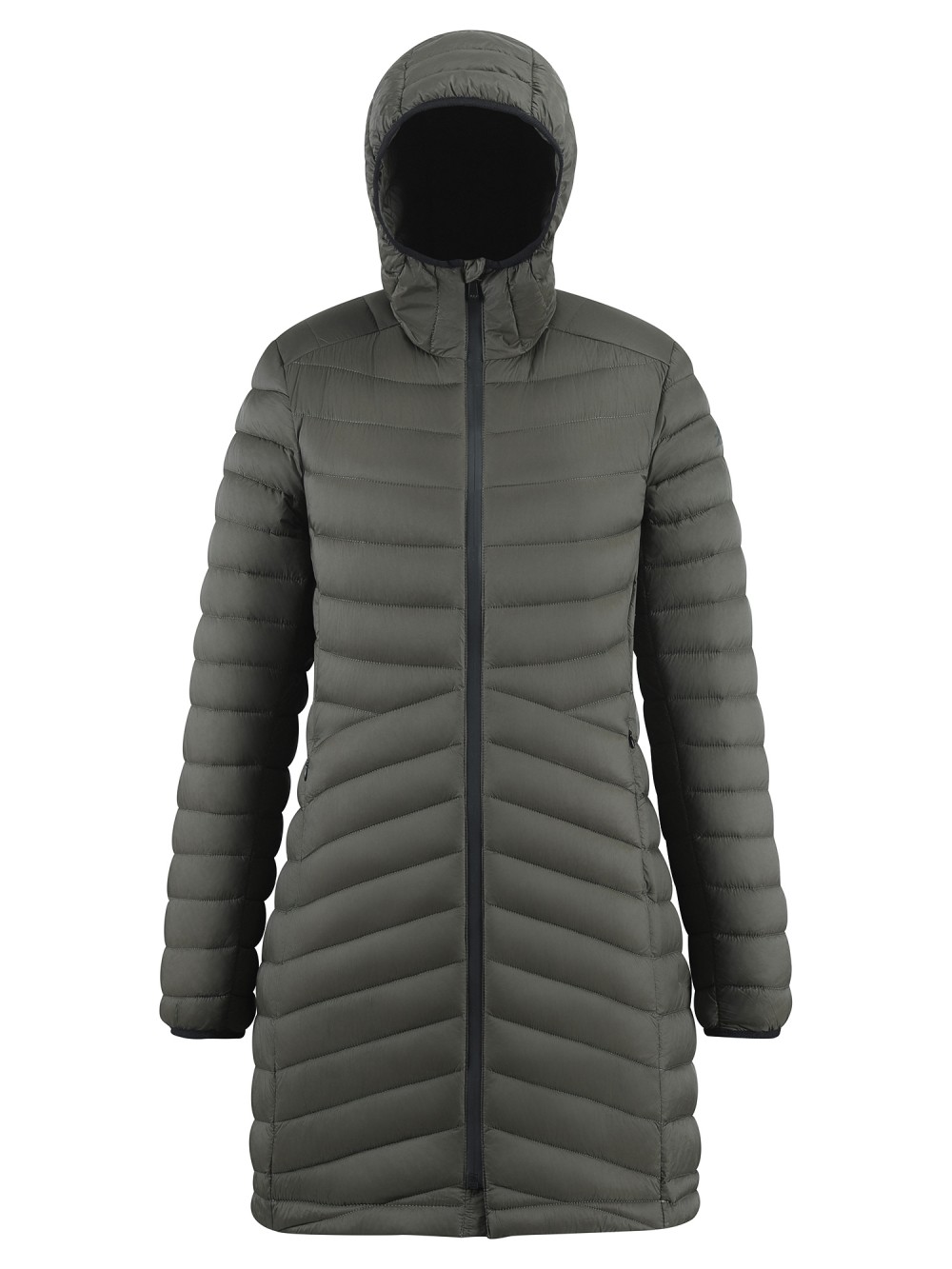 Куртка женская удлинённая стёганая с капюшоном и графеновой подкладкой цвета хаки 9628_1Kh