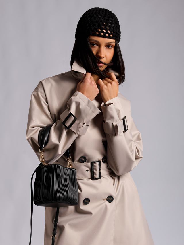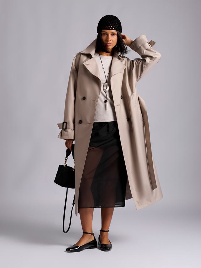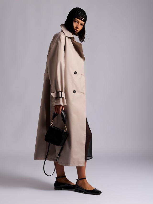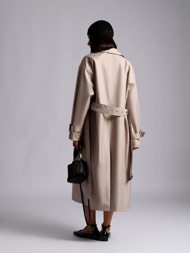 Двубортный демисезонный плащ прямого кроя с патами на рукавах, отложным воротником и высоким разрезом сзади.
