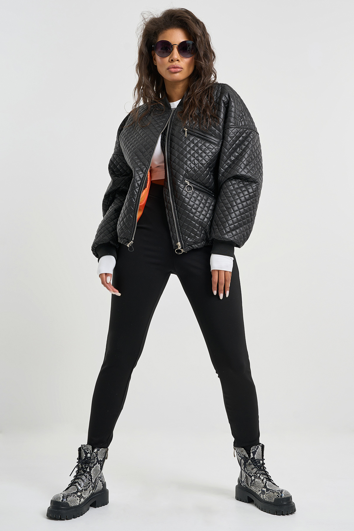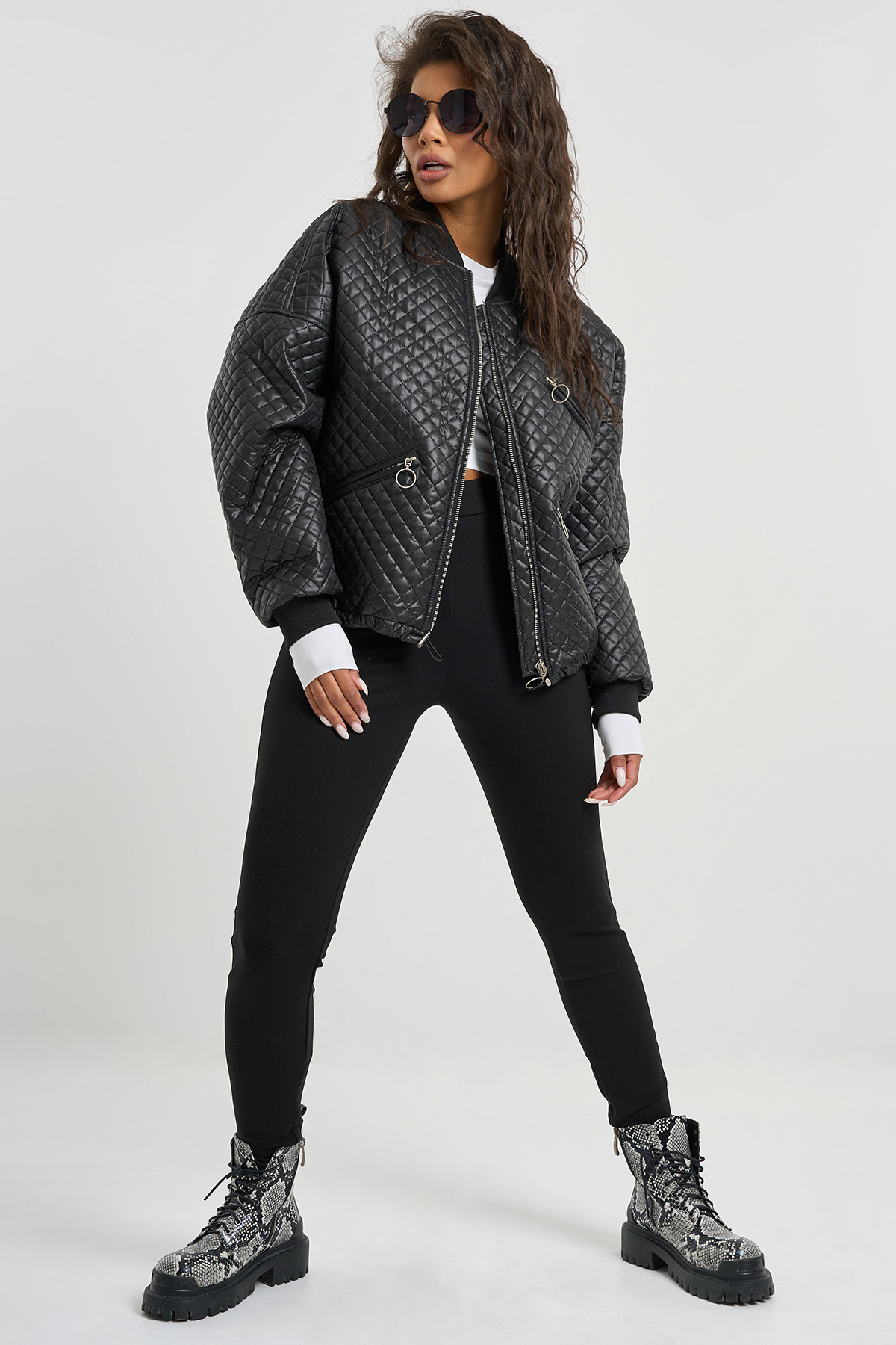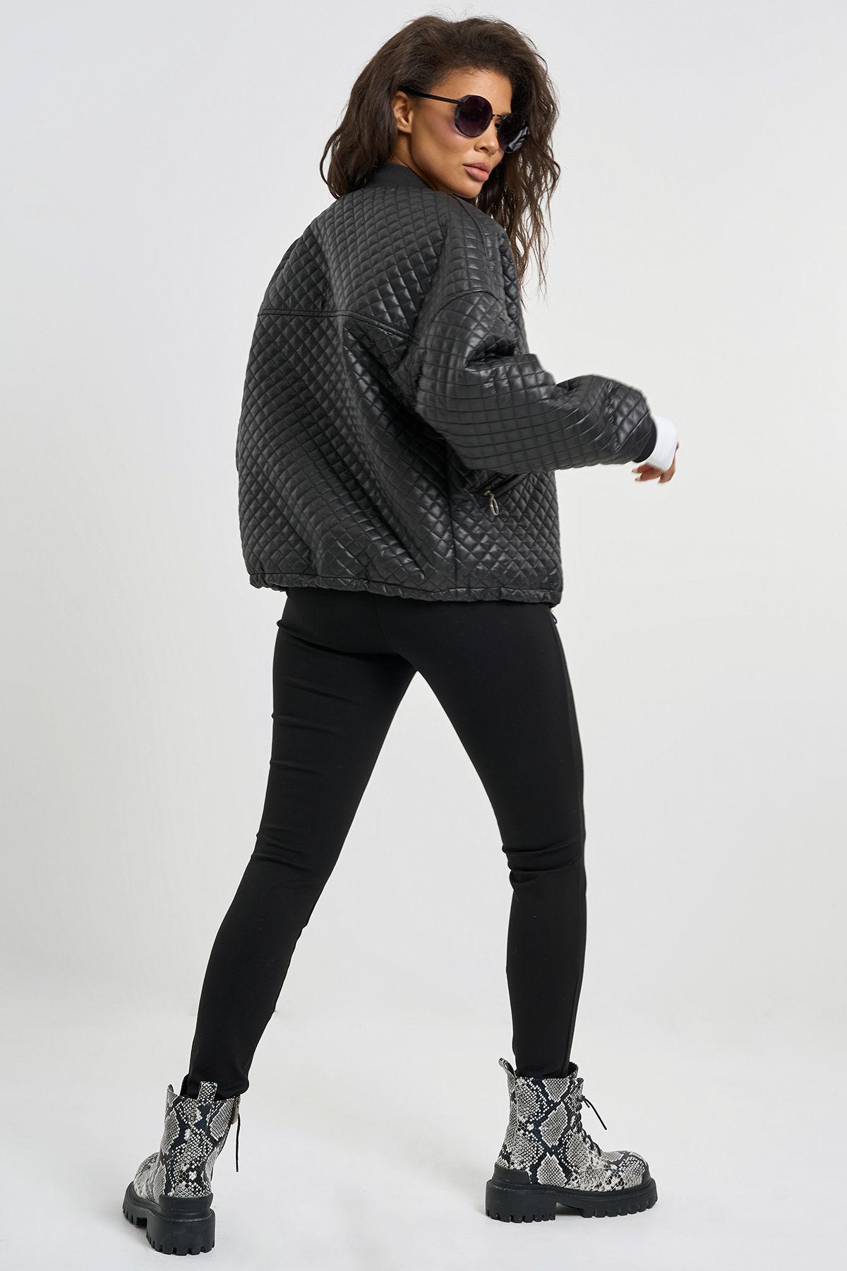 • Особенности: Укороченный бомбер свободного силуэта из стеганной плащевой ткани на подкладке. Детали: воротник стойка, спущенная линия плеча, длинный рукав с трикотажной манжетой, по переду прорезные карманы в рамку  с молнией, по низу кулиска с утягивающей резинкой. Застежка бомбера на молнию с ветрозащитной планкой.