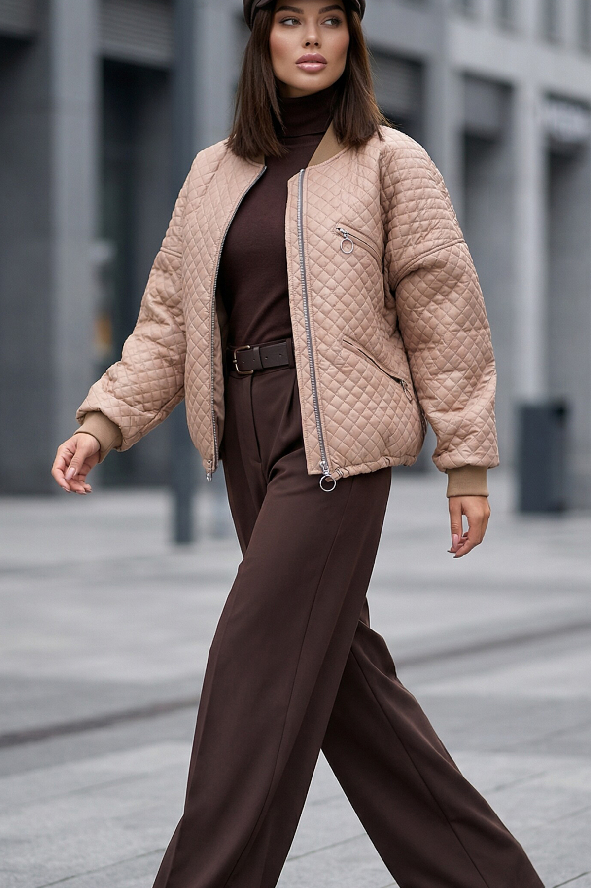 • Особенности: Укороченный бомбер свободного силуэта из стеганной плащевой ткани на подкладке. Детали: воротник стойка, спущенная линия плеча, длинный рукав с трикотажной манжетой, по переду прорезные карманы в рамку  с молнией, по низу кулиска с утягивающей резинкой. Застежка бомбера на молнию с ветрозащитной планкой.