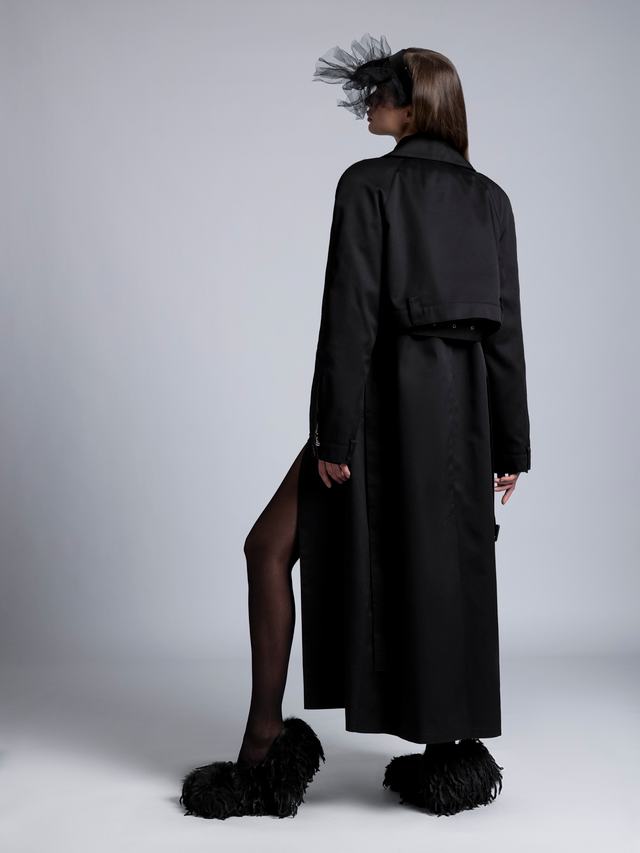 Изделие уникального кроя, который повторяет линии перевернутых брюк, сделает ваш стиль неподражаемым. Прямой крой и 130 см длины сделают вас выше и худее. Благодаря рукаву реглану плащ идеально садится на плечи и не создает лишнего объема.