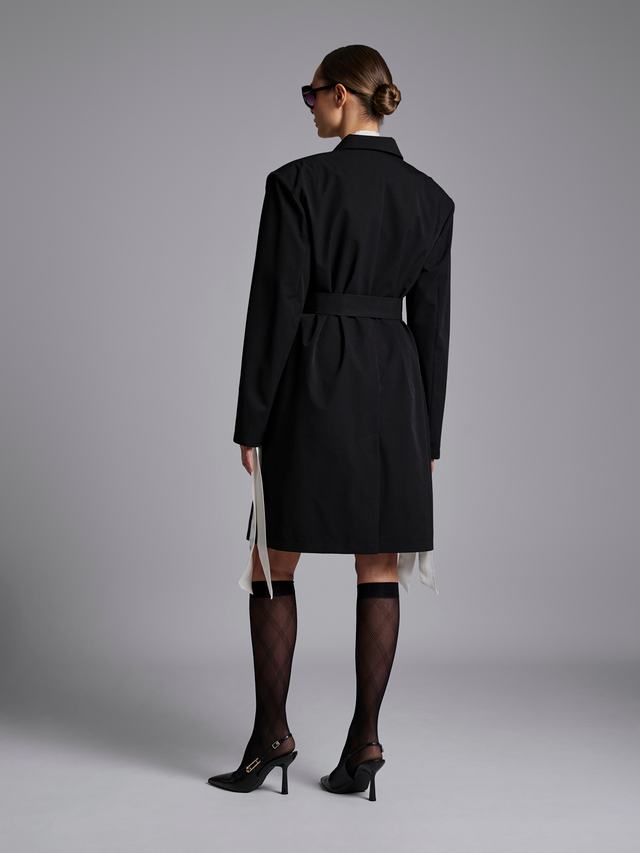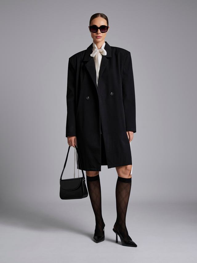Крой изделия повторяет линии пиджака с широкими плечами и английским воротником. Плащ длиной в 100 см — идеальный баланс между удобством и элегантностью.