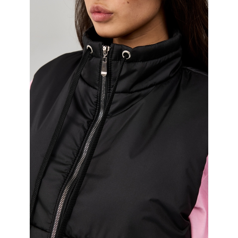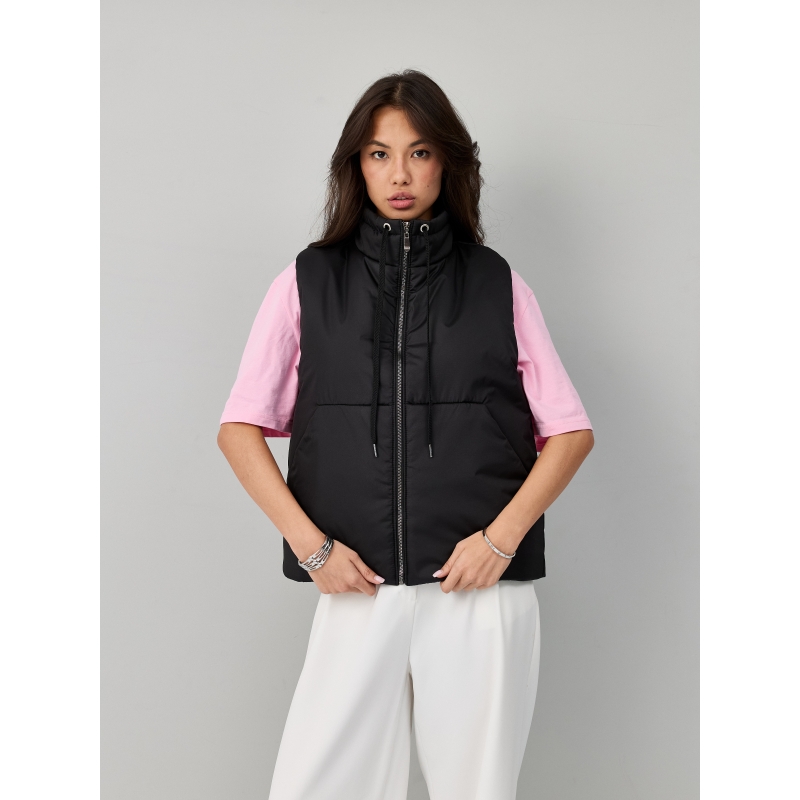 Утепленный жилет из водоотталкивающей ткани с воротником-стойкой на кулиске, накладными карманами и с застежкой-молнией спереди.