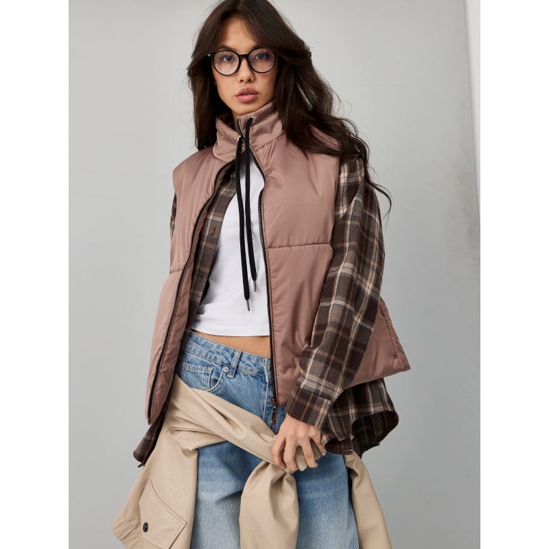 Утепленный жилет из водоотталкивающей ткани с воротником-стойкой на кулиске, накладными карманами и с застежкой-молнией спереди.