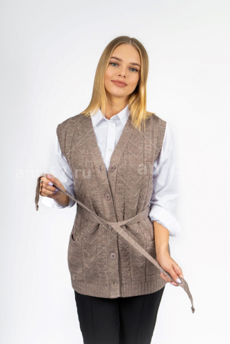 Жилет вязаный, полуприлегающего силуэта с застежкой на петли и пуговицы. На полочках вывязаны карманы, край бортов с планками. Проймы с притачными обтачками.