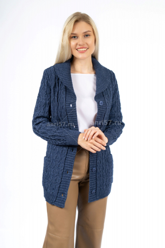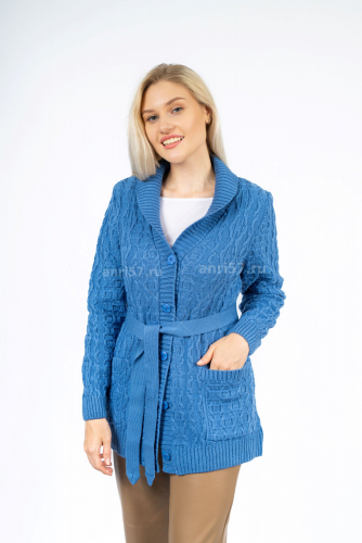 Кардиган женский ж0520. Кардиган полуприлегающего силуэта из фактурного вязаного полотна с центральной застежкой на петли и пуговицы. Полочка с накладными карманами, воротник отложной - "шалька". Рукав втачной на "резинке" по низу. В комплекте пояс. Состав: 30% Шерсть, 70% ПАН.