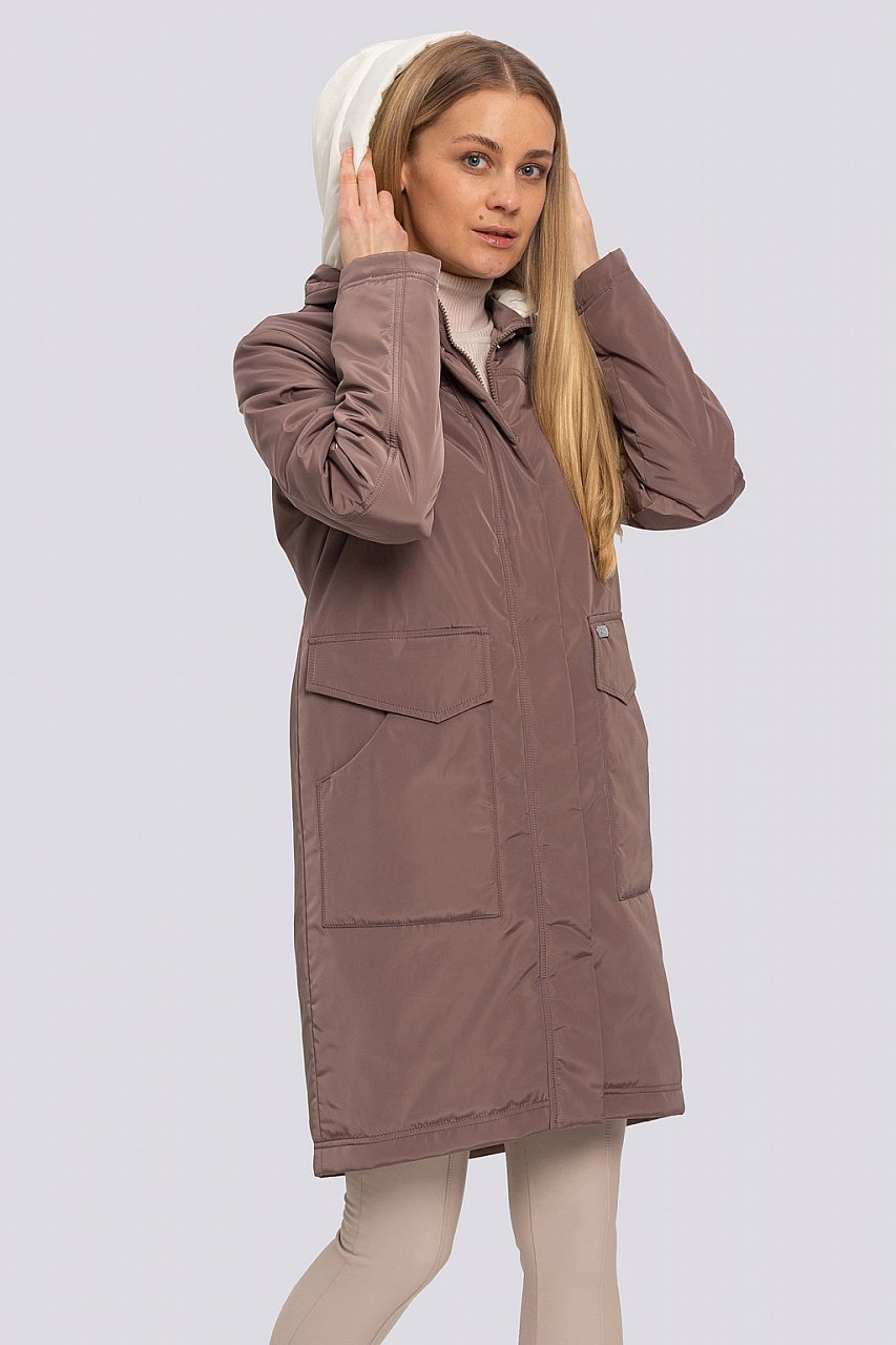 Легкое пальто из плащевой ткани — отличный вариант на межсезонье, плотная ткань защитит от ветра и дождя. Изделие прямого силуэта, объем изделия свободный. Отличительная особенность — отстегивающийся капюшон цвета слоновой кости прекрасно смотрится около лица. Накладные карманы уже несколько сезонов очень популярны — также присутствуют в нашей модели. По линии низа спинка длиннее переда. Утеплитель термофин, плотность 100. капучино