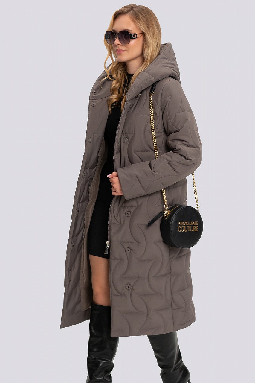 В этом году, как и в предыдущих, не теряют свою актуальность стеганые пальто. Изделие из данной ткани более практичное и удобное в использовании. Пальто в классическом стиле, полуприлегающего силуэта. Умеренный объем изделия идеально подходит для создания уютного образа, который при этом будет выглядеть стильно и элегантно. Втачной покрой рукава идеален для любой фигуры, придает стройность и строгость образу. Капюшон – очень удобная и актуальная деталь верхней одежды, защитит от ветра и холода. Рукав отгибается на манжет. Модель отлично смотрится с поясом и без. Пальто застегивается на кнопки и внутреннюю молнию. Новый вид стежки несомненно приковывает взгляды окружающих. Нам удалось продлить сезон носки изделия, за счет внедрения в производство нового вида стеганой ткани. Ткань верха плотная и многослойная. Утеплитель термофин, плотность 200. Температурный режим до -10. серо-коричневый