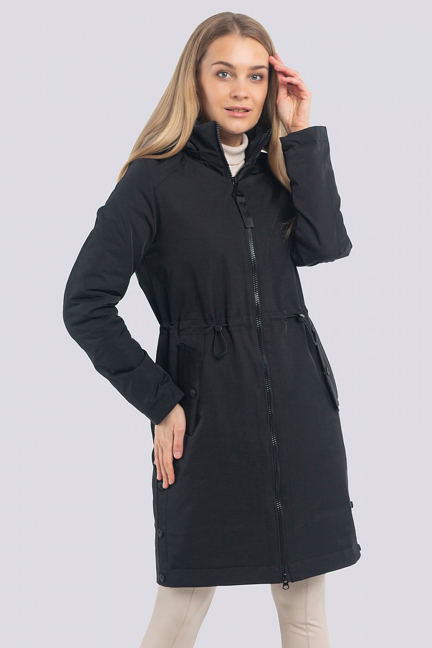 Парка женская демисезонная с капюшоном. Теплая куртка выполнена из плотной ткани. Весенняя куртка имеет отстегивающийся капюшон, который надежно защитит вас от дождя, ветра и мокрого снега. Удлиненная теплая курточка на молнии легкая и комфортная. Линию талии можно подчеркнуть с помощью кулиски. Застежка на молнии надежно сохранят тепло. Боковые карманы декорированы клапанами. Универсальная модель для любого типа фигуры. Свободный прямой крой делает фигуру привлекательнее. Утеплитель термофин, плотность 100. Состав ткани: 50% хлопок, 30% вискоза, 20% полиэстер. черный