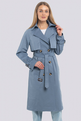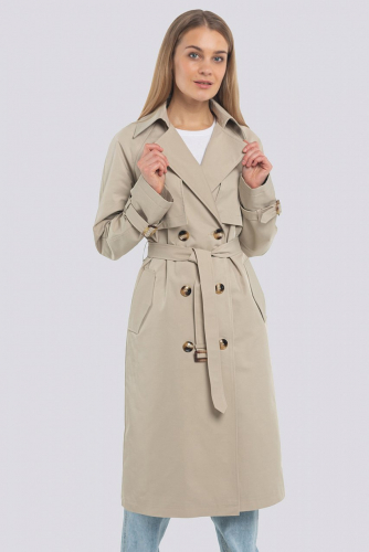 Двубортный плащ – элегантный и стильный вариант верхней одежды для межсезонья. Легкий плащ идеален для прохладного лета и теплого межсезонья. Двубортная застежка, традиционные роговые пуговицы и пряжки, кокетки, широкий рукав с хлястиком – характерные особенности модного тренча. Длина, свободный объем, А-силуэт, подчеркнутый поясом, придают образу хрупкость и женственность. Покрой рукава – реглан, сзади – шлица, отложной воротник со стойкой. Состав ткани: 50% хлопок, 30% вискоза, 20% полиэстер.