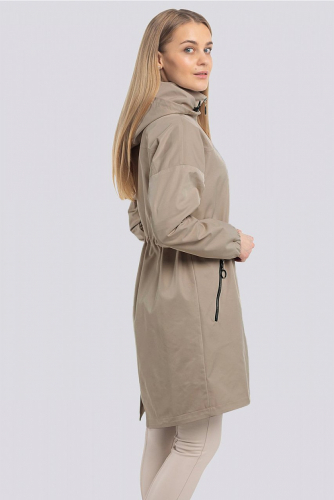 Модный женский плащ с капюшоном незаменимая вещь в женском гардеробе. Модель плаща соответствует стилю casual. Отлично сочетается с брюками, джинсами. Он универсальный, практичный, удобный. Плащ свободного объема со спущенной линией плеч. Застежка и карманы на «молнии», воротник –стойка. По талии кулиса , низ рукава на резинке. Низ плаща фигурный, на спинке разрез. Есть отстегивающийся капюшон. Состав ткани: 50% хлопок, 30% вискоза, 20% полиэстер.