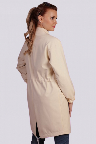 Даже летом жаркие дни порой сменяются прохладой. Не нужно доставать с дальних полок теплые вещи, если под рукой есть летний плащ. Мы предлагаем всеми любимую модель плаща-парки в преображенном городском стиле с легким оттенком гламура (отделка стразами и серебряной тесьмой). Ткань бондинг состоит из двух слоев: верхний слой костюмная ткань, нижний слой-тонкое трикотажное полотно. Такое сочетание придает ему нужную плотность, хорошо пропускает воздух. Нежные тона ткани напоминают о приближающемся летнем сезоне. Модель имеет слегка расклешенный силуэт. Объем изделия по линии низа и талии регулируется с помощью кулисы. Застежка на молнию, закрытую планкой с кнопками. Длина рукава 7/8. бежевый