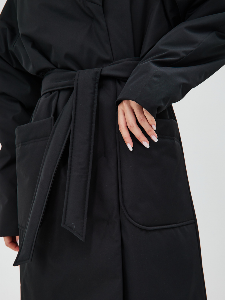 Утепленный плащ прямого силуэта с капюшоном и застежкой на потайные кнопки. В изделии имеются два накладных кармана с удобным входом и один внутренний. В комплекте есть пояс из основного материала. Ткань - плащевая с водоотталкивающей пропиткой. Утепление - синтепон ОRSOTERM 100 гр. Рекомендуемый температурный режим (от +10°C до +18°C). Длина изделия - 112 см. Длина рукава - 66 см. Размеры: 42-56.