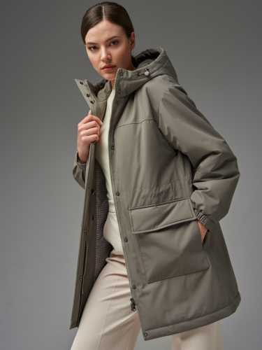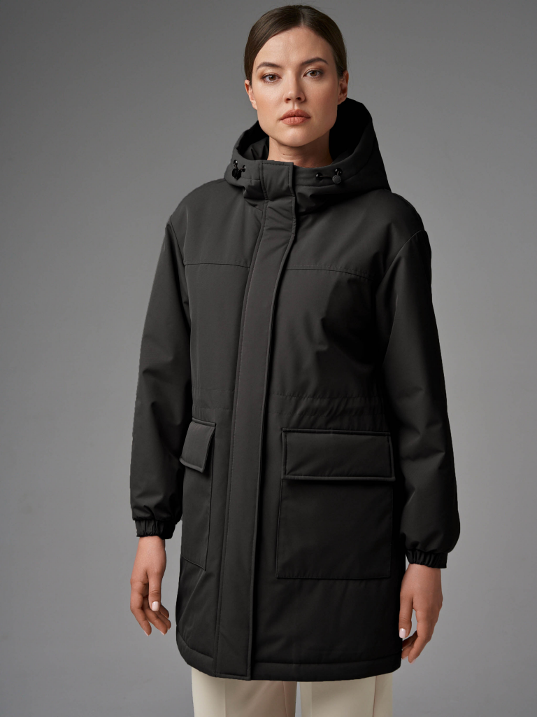 Длина изделия по спинке: 100 см Длина рукава: 64 см Плотность утеплителя: синтепон 100 г/м2 Температурный режим: от +10°C до +18°C Покрой: прямой Тип рукава: спущенное плечо, внизу оформлен резинкой Тип карманов: накладные. Карманы имеют два входа. Состав: 100% полиэстер Материал подкладки: 100% полиэстер Ткань: матовая с мембраной. Размеры: 42-56 Детали: Капюшон не съемный, застежка на молнию в цвет и потайные кнопки.