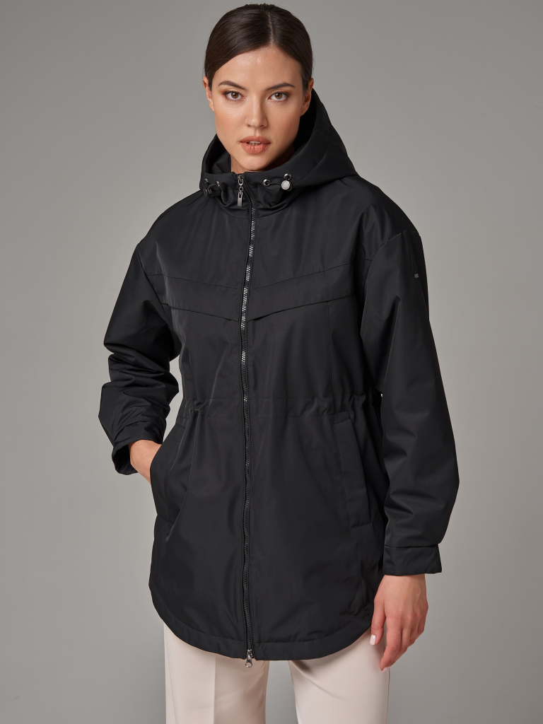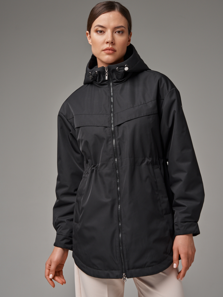 Утепленный плащ а-силуэта с внутренней утяжкой на уровне талии. В модели есть втачной капюшон с утяжкой. Рукав со спущенным плечом. Низ рукава оформлен манжетой. По спинке и полочкам есть декоративные отлетные кокетки. В изделии низ оформлен фестонами. В плаще два функциональных кармана с листочками на потайных кнопках и один внутренний карман. Застежка на молнию. Ткань плащевая с водоотталкивающей пропиткой. Утепление нового поколения ORSOTHERM 60 гр. (от +15°C до +20°C). Длина изделия: 82 см (размеры 42-48), 87 см (размеры 50-56) Длина рукава: 64 см. Размеры: 42-56.