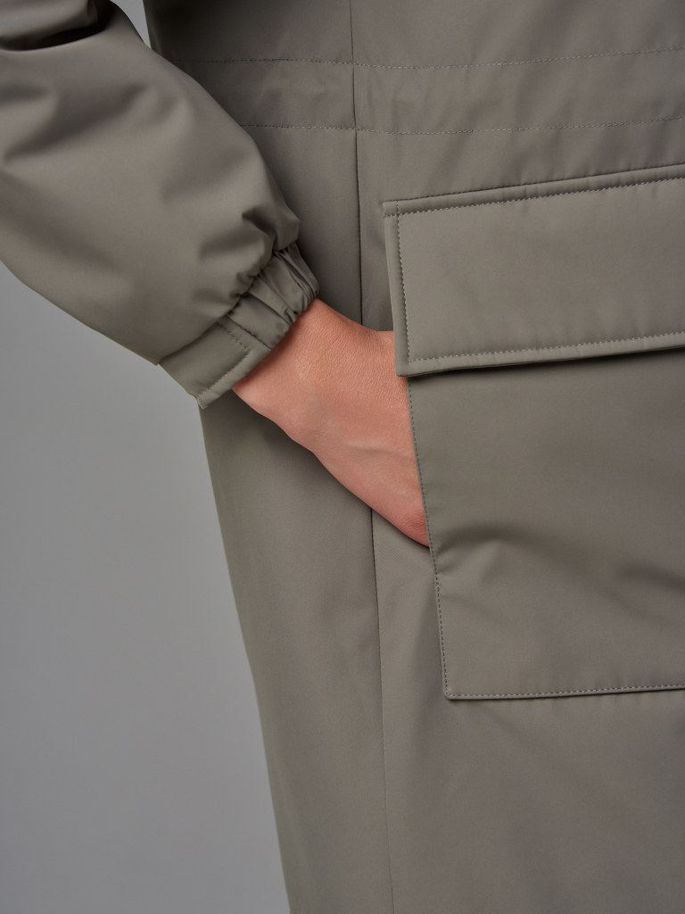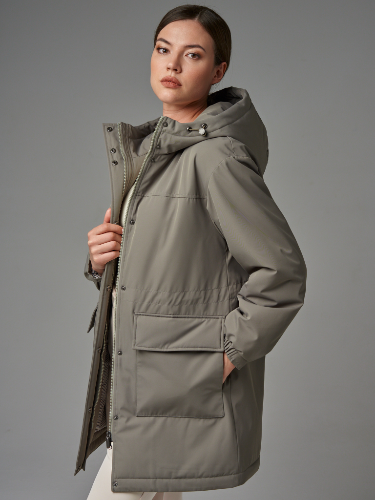 Длина изделия по спинке: 100 см Длина рукава: 64 см Плотность утеплителя: синтепон 100 г/м2 Температурный режим: от +10°C до +18°C Покрой: прямой Тип рукава: спущенное плечо, внизу оформлен резинкой Тип карманов: накладные. Карманы имеют два входа. Состав: 100% полиэстер Материал подкладки: 100% полиэстер Ткань: матовая с мембраной. Размеры: 42-56 Детали: Капюшон не съемный, застежка на молнию в цвет и потайные кнопки.