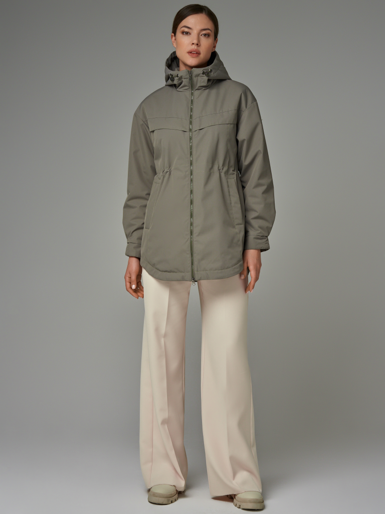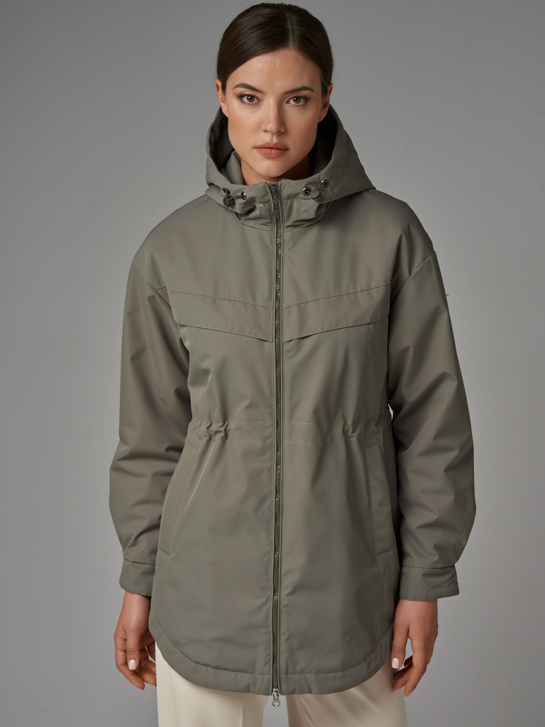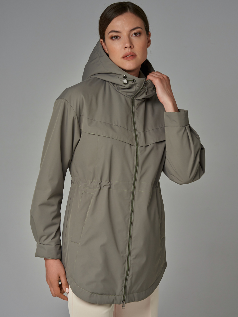 Утепленный плащ а-силуэта с внутренней утяжкой на уровне талии. В модели есть втачной капюшон с утяжкой. Рукав со спущенным плечом. Низ рукава оформлен манжетой. По спинке и полочкам есть декоративные отлетные кокетки. В изделии низ оформлен фестонами. В плаще два функциональных кармана с листочками на потайных кнопках и один внутренний карман. Застежка на молнию. Ткань плащевая с водоотталкивающей пропиткой. Утепление нового поколения ORSOTHERM 60 гр. (от +15°C до +20°C). Длина изделия: 82 см (размеры 42-48), 87 см (размеры 50-56) Длина рукава: 64 см. Размеры: 42-56.