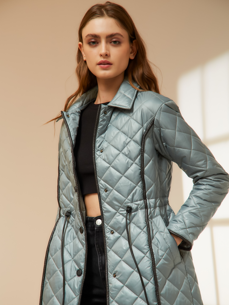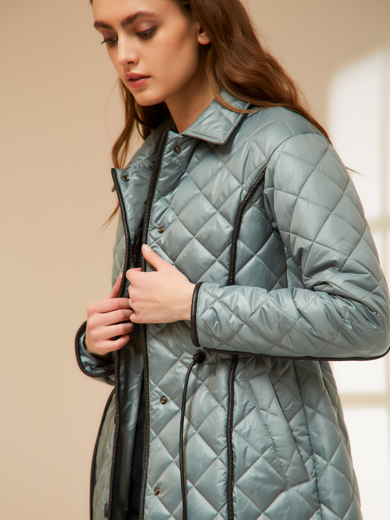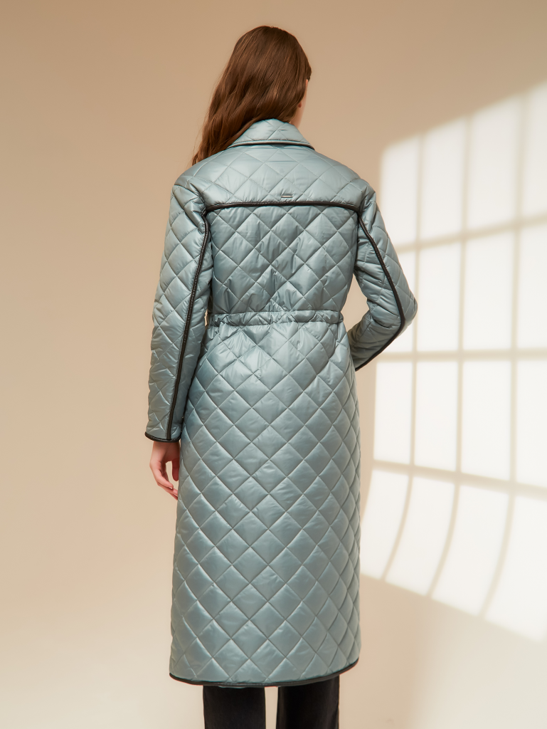 Стильный стеганый однобортный плащ прямого силуэта с кантами и утяжкой на уровне талии. Застежка на кнопках. Кулиска выполнена из эко-кожи. Рукав со спущенным плечом. Имеются два кармана с листочками на кнопках. Есть внутренний карман. Ткань изделия обработана качественной водоотталкивающей пропиткой. Утепление нового поколения ORSOTERM 100 гр., рекомендуемый температурный режим от +10°C до +18°C. Длина изделия: 120 см. Длина рукава: 64 см. Размеры: 42 - 56.