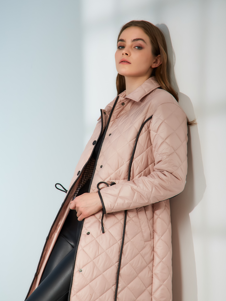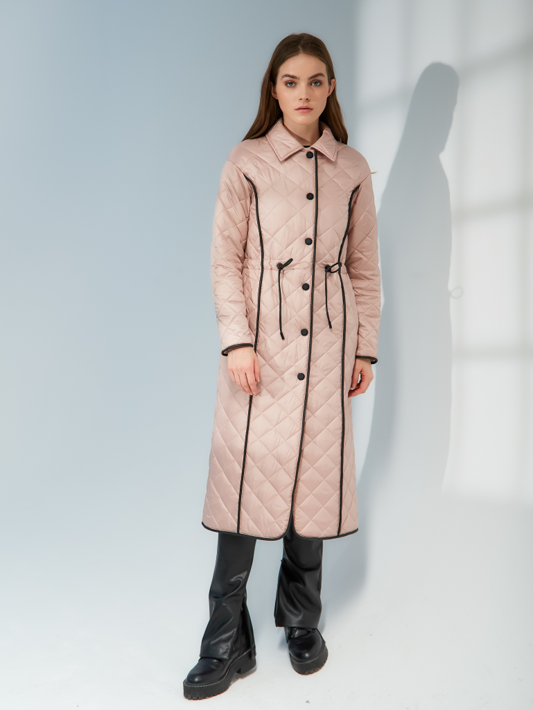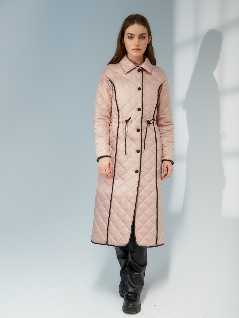 Стильный стеганый однобортный плащ прямого силуэта с кантами и утяжкой на уровне талии. Застежка на кнопках. Кулиска выполнена из эко-кожи. Рукав со спущенным плечом. Имеются два кармана с листочками на кнопках. Есть внутренний карман. Ткань изделия обработана качественной водоотталкивающей пропиткой. Утепление нового поколения ORSOTERM 100 гр., рекомендуемый температурный режим от +10°C до +18°C. Длина изделия: 120 см. Длина рукава: 64 см. Размеры: 42 - 56.