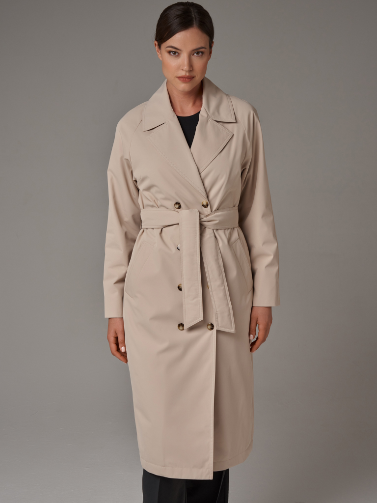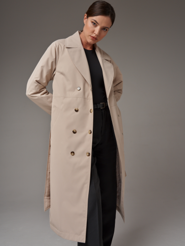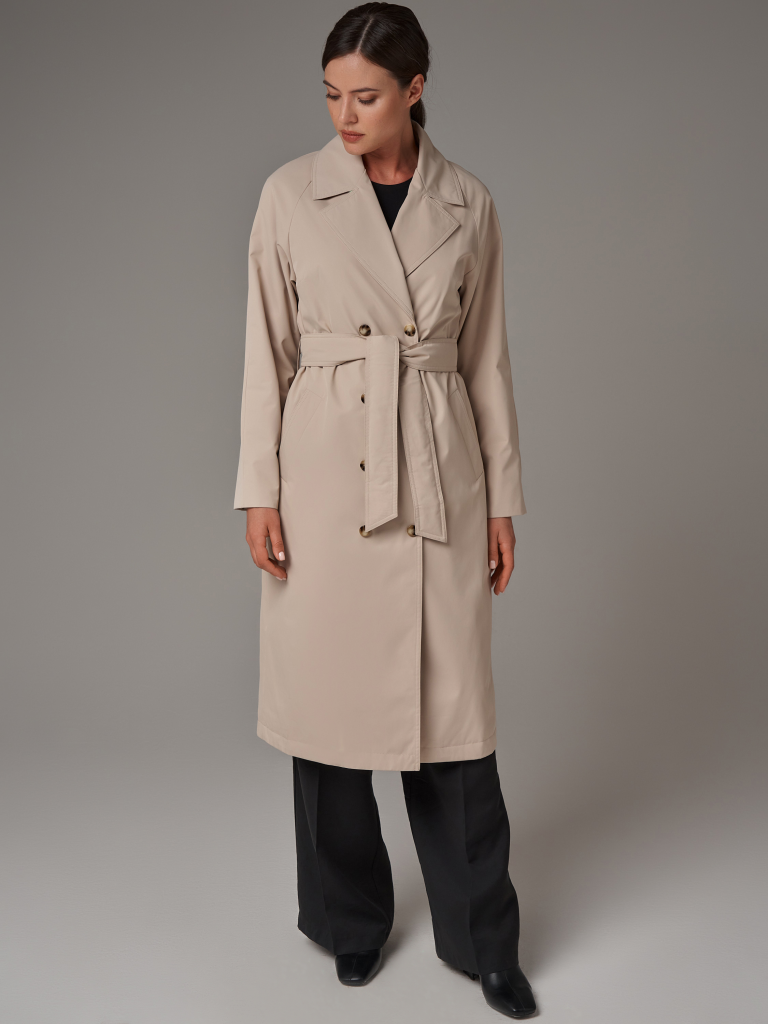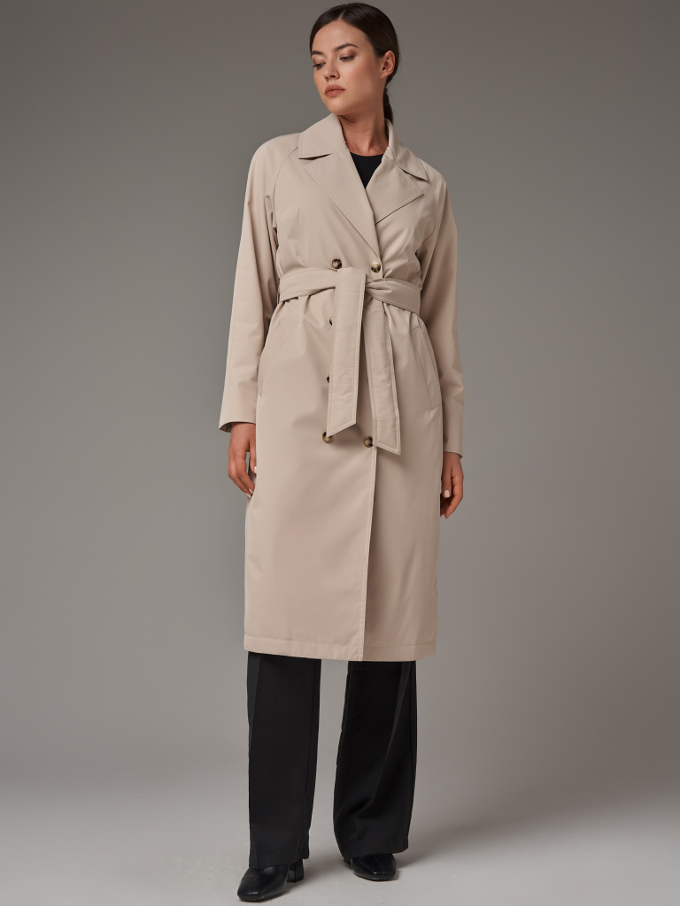 Утепленный плащ прямого силуэта. Рукав реглан с удобной заниженной проймой. Застежка декоративные кнопки. В изделии два кармана, оформленных листочками на потайных кнопках и один внутренний карман. Плащ утягивается на спине по линии талии на широкую резику. В комплекте есть пояс из основной ткани. Ткань плащевая, матовая на мембране и с водоотталкивающей пропиткой. Утепление нового поколения ORSOTHERM 60 г/м2. Рекомендуемый температурный режим(от +13°C до +18°C). Длина изделия -110 см. Длина рукава - 64 см.