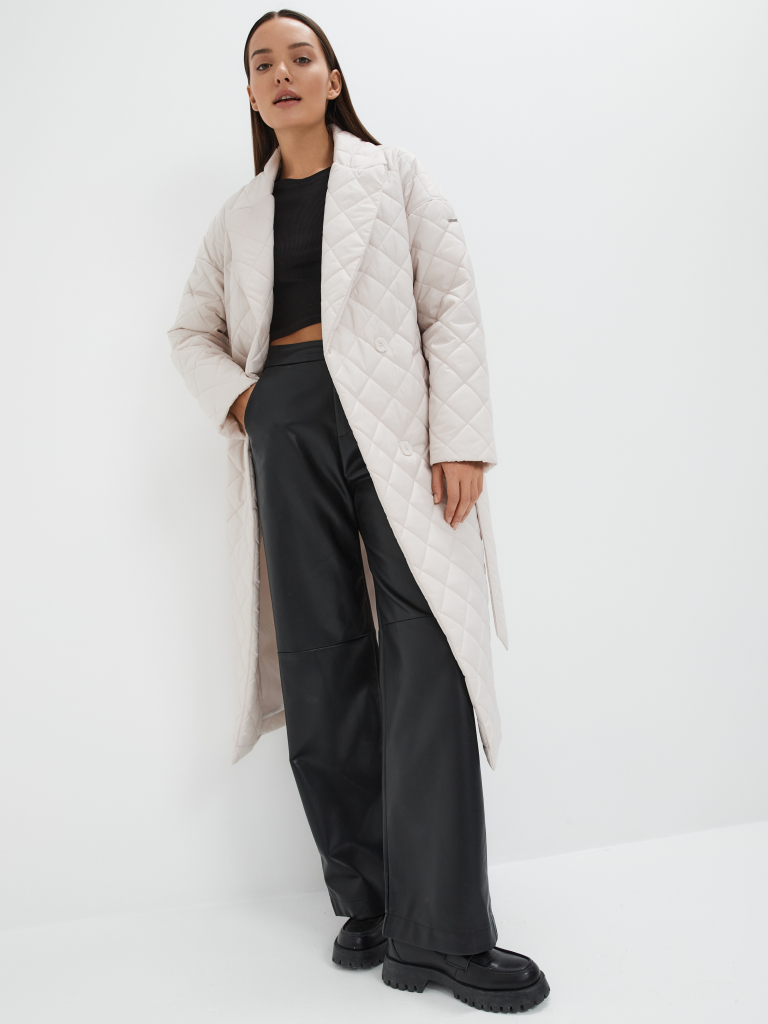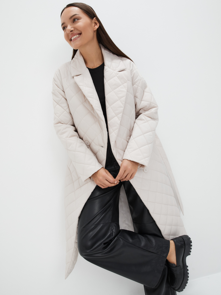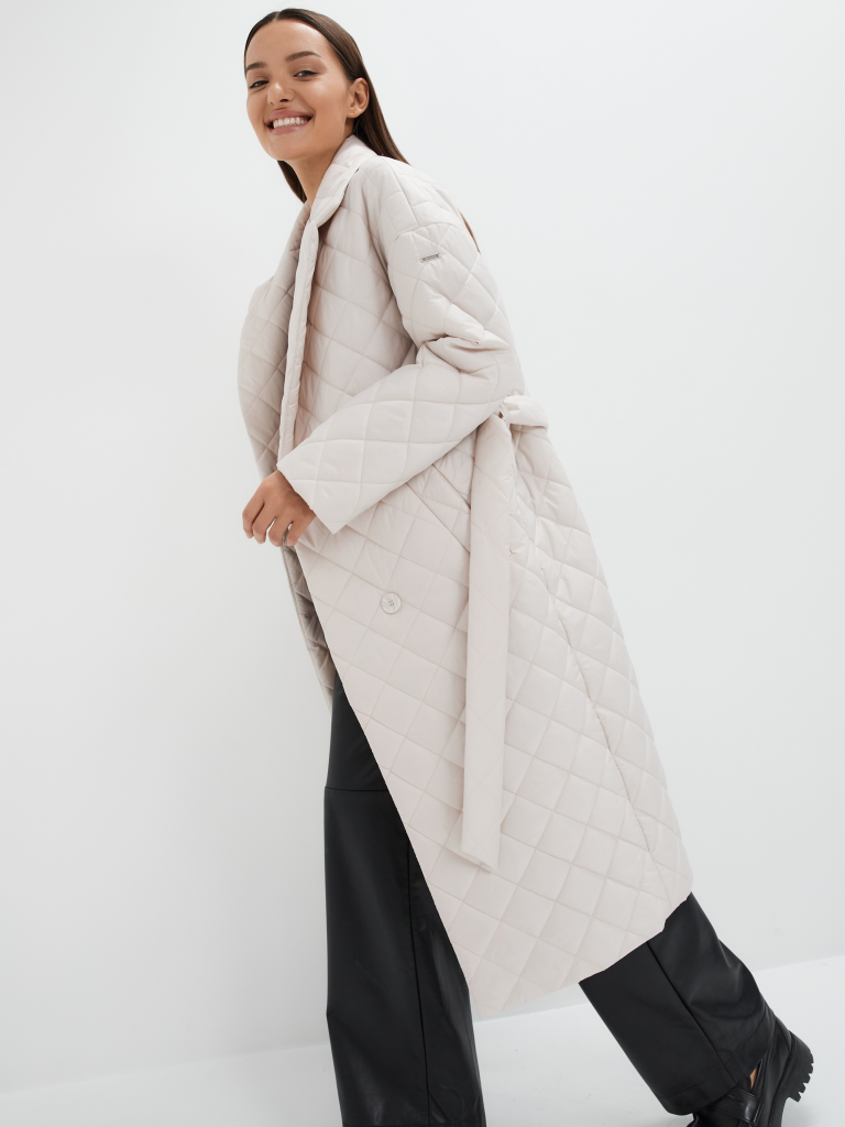 Классический стеганый плащ силуэта "кокон" . Рукав со спущенным плечом. Застежка на пуговицы в цвет изделия. В изделии имеются два функциональных кармана с листочками на и один внутренний карман. В комплекте с изделием идет пояс из основной ткани. Ткань - плащевая с водоотталкивающей пропиткой. Утепление нового поколения ORSOTHERM 100 гр. (от +10°C до +18°C). Длина изделия: 115 см Длина рукава: 64 см. Размеры: 42-56.