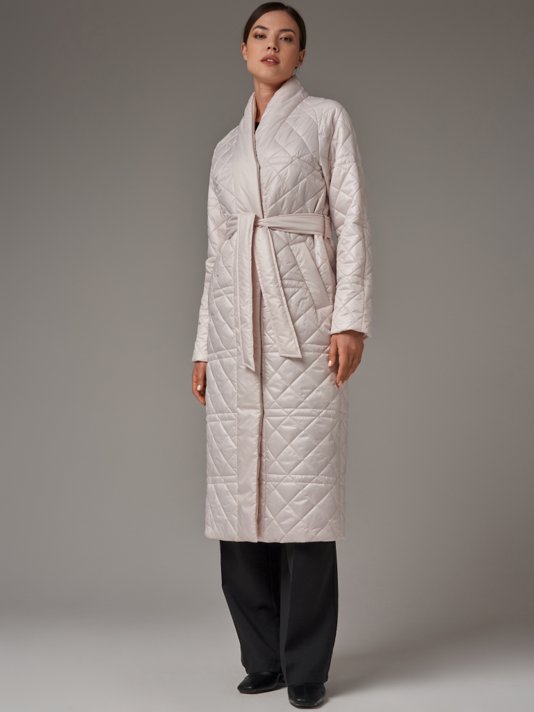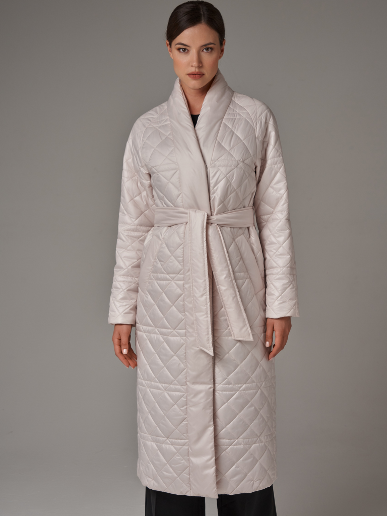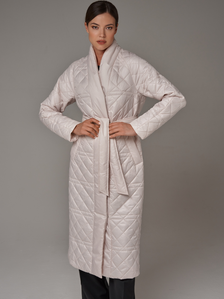 Стеганый плащ-кимоно прямого силуэта. Рукав реглан с заниженной проймой. Застежка на потайные кнопки. В изделии два кармана, оформленных листочками на потайных кнопках и один внутренний карман. В комплекте с плащом идет пояс из основной ткани. Ткань плащевая с водоотталкивающей пропиткой, простеганная ромбом. Утепление нового поколения ORSOTHERM 100 г/м2. Рекомендуемый температурный режим(от +10°C до +18°C). Длина изделия -120 см. Длина рукава - 64 см.