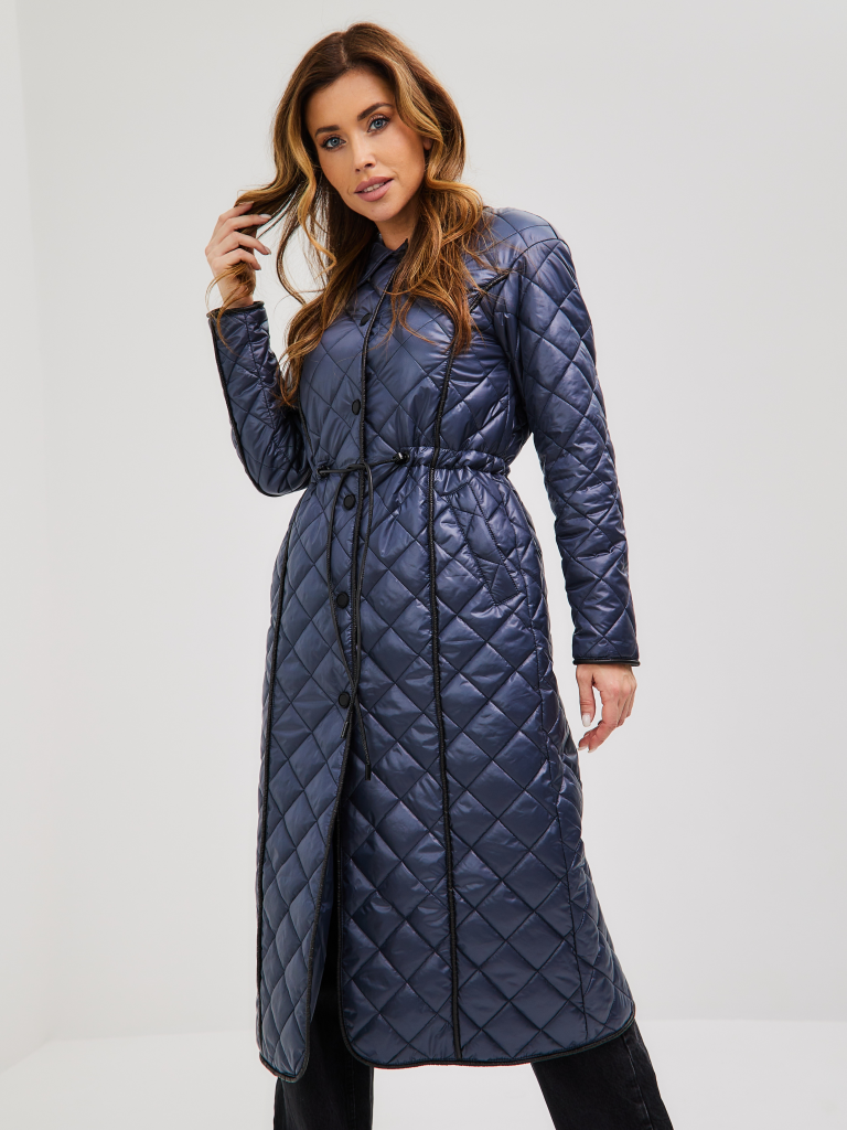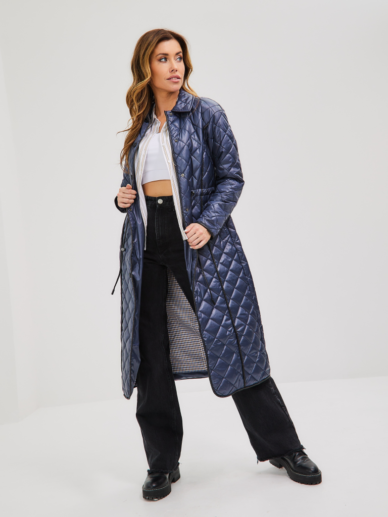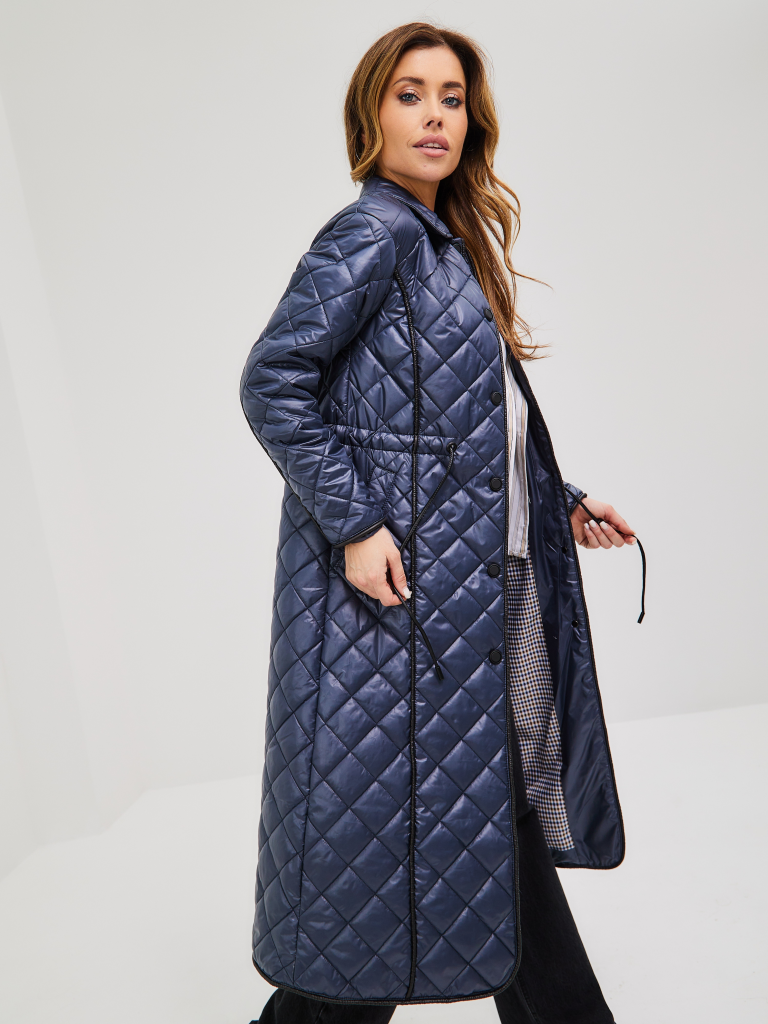Стильный стеганый однобортный плащ прямого силуэта с кантами и утяжкой на уровне талии. Застежка на кнопках. Кулиска выполнена из эко-кожи. Рукав со спущенным плечом. Имеются два кармана с листочками на кнопках. Есть внутренний карман. Ткань изделия обработана качественной водоотталкивающей пропиткой. Утепление нового поколения ORSOTERM 100 гр., рекомендуемый температурный режим от +10°C до +18°C. Длина изделия: 120 см. Длина рукава: 64 см. Размеры: 42 - 56.