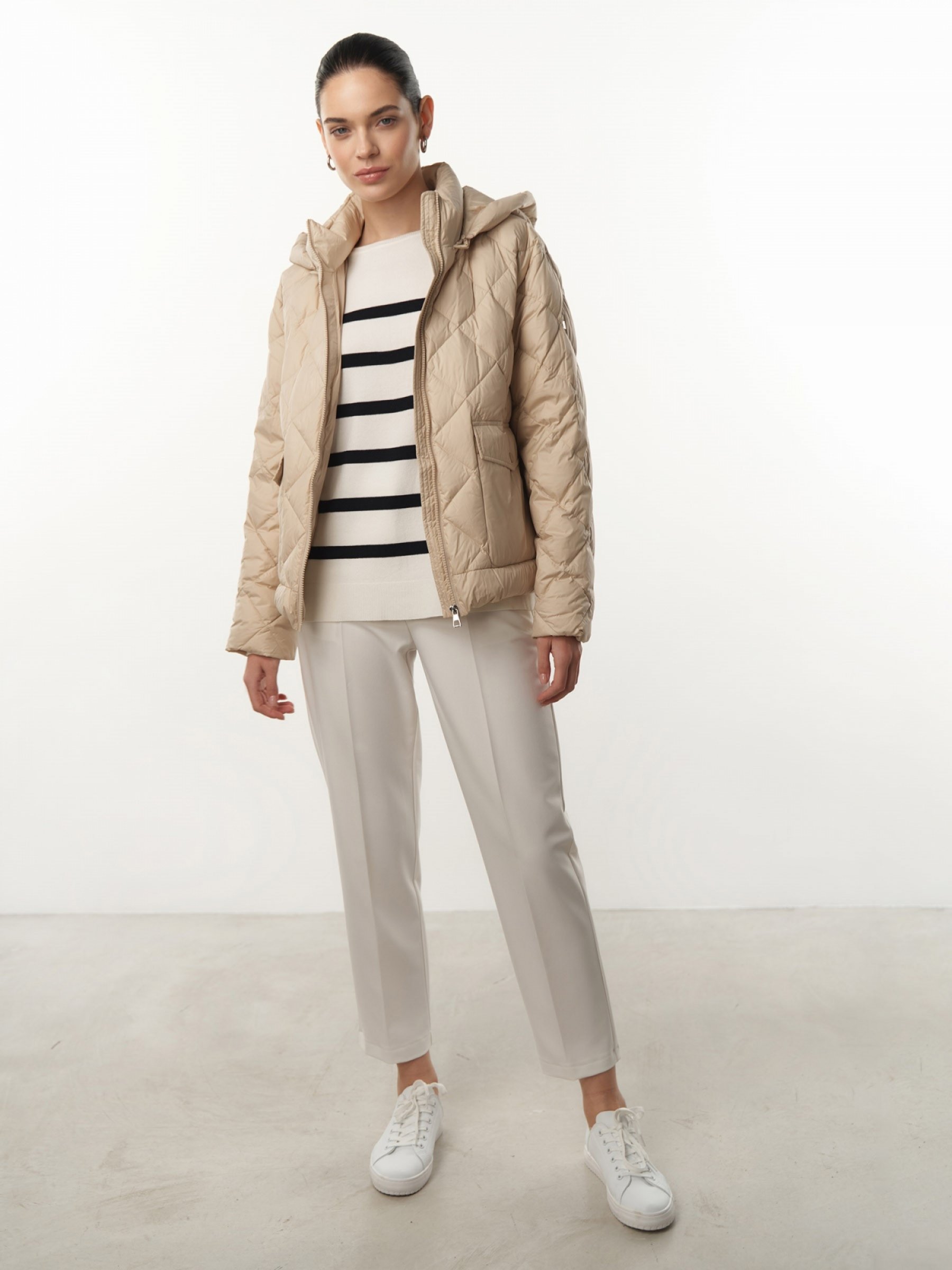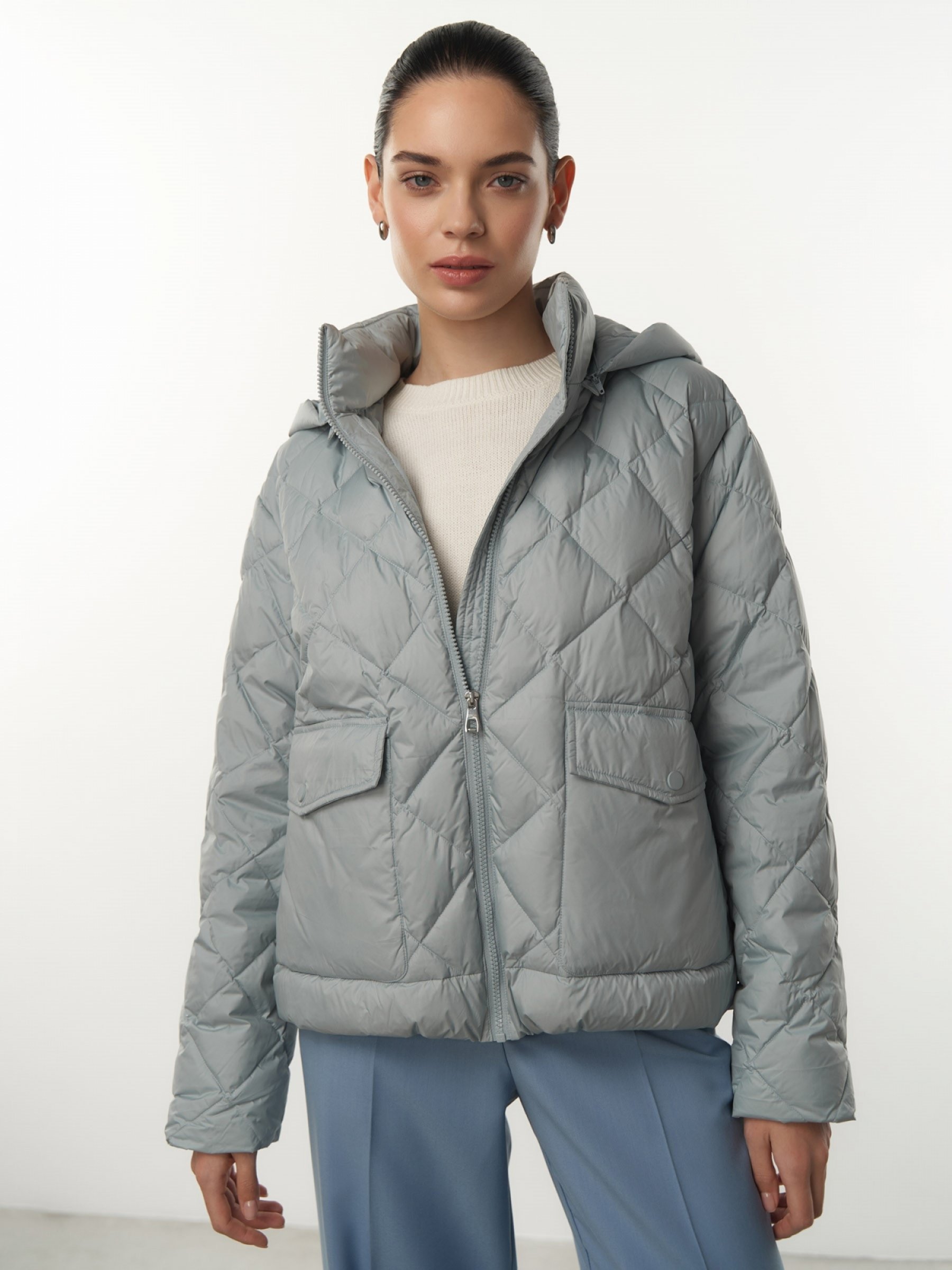 Укороченная куртка для повседневной носки. Ромбовидная стежка – украшение изделия. Куртка выполнена из прочного, легкого и простого в уходе материала, утеплитель – пух и перо. Застегивается на пластиковую молнию в тон. Модель дополнена съемным утепленным стеганым капюшоном, воротником-стойкой и удобными накладными карманами с клапанами, застегивающимися на матовую кнопку в тон. Три универсальных пастельных цвета: зеленый, голубой и беж. верх: 100% полиэстер; подклад: 100% полиэстер; наполнитель: 90% пух, 10% перо