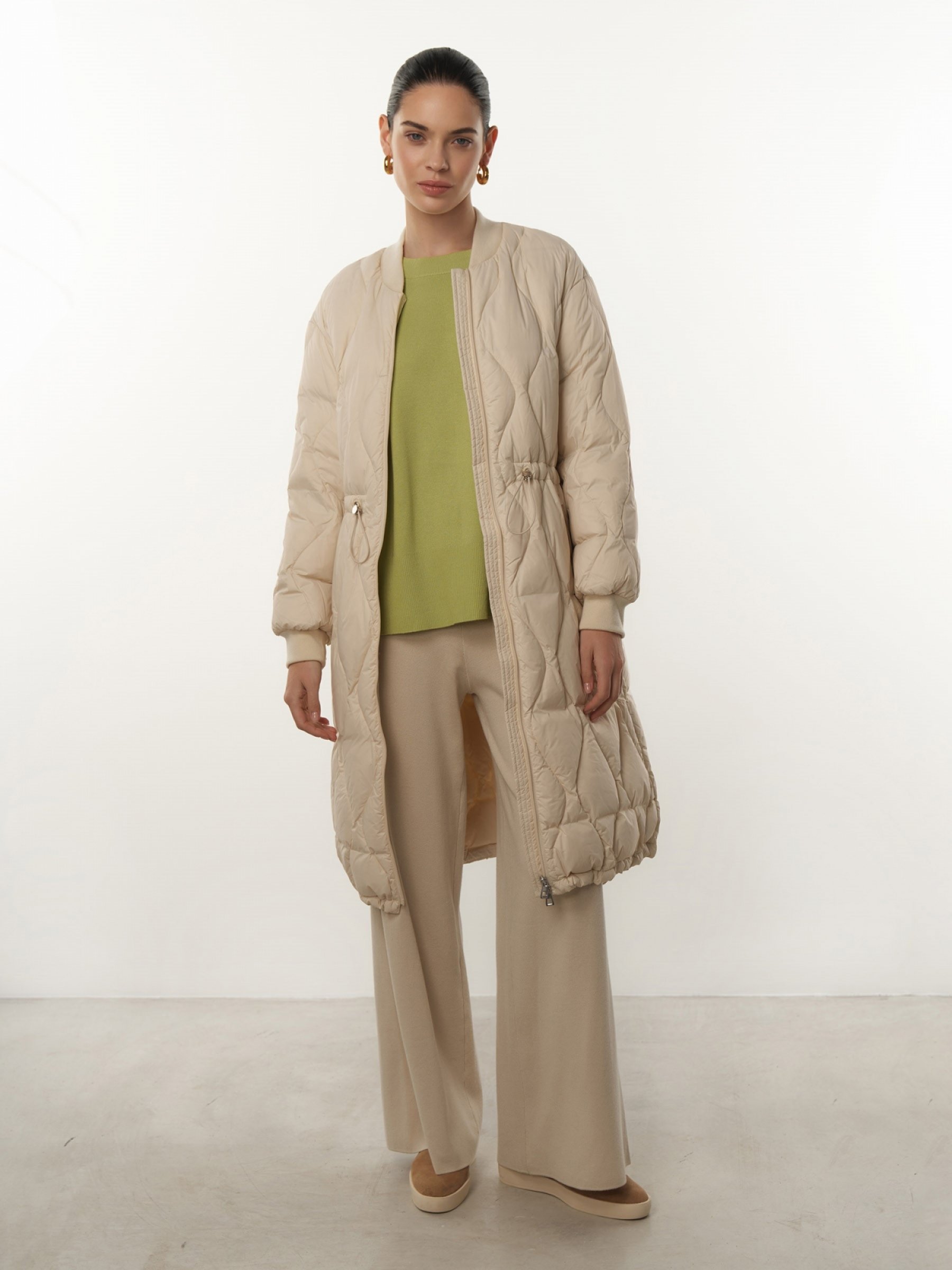Удлиненное пальто в спортивном стиле – модное и динамичное. Выполнено из качественного износоустойчивого полиэстера, утеплено отборным пухом и пером. Волнообразная стежка украшает изделие. Детали: трикотажные воротник и манжеты в тон, вместительные боковые карманы на молнии. Застегивается на двустороннюю молнию. Кулиска и молния позволяют регулировать ширину изделия. Три красивых базовых цвета: тофу, хаки и черный. верх: 100% нейлон; подклад: 100% нейлон; наполнитель: 90% пух, 10% перо