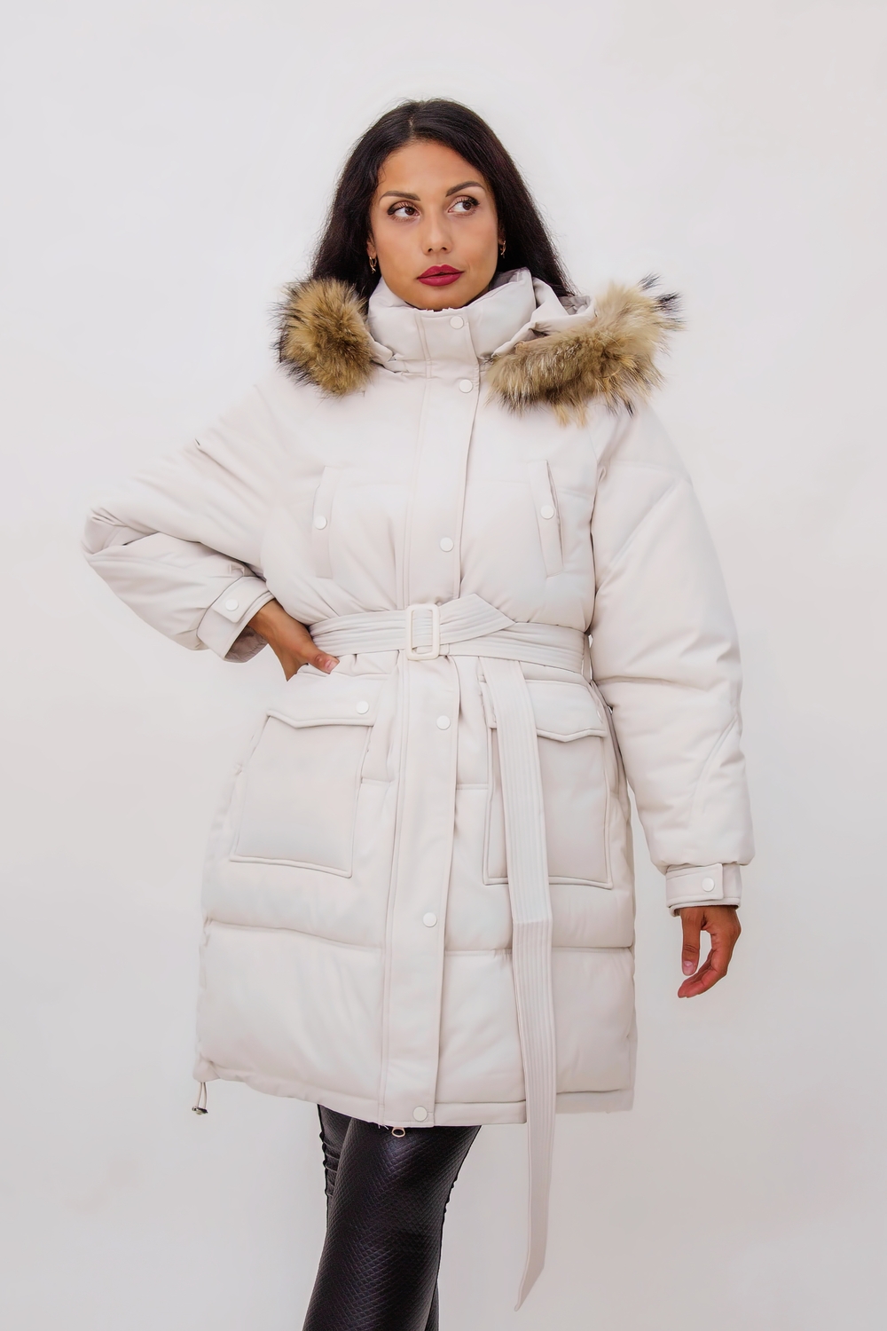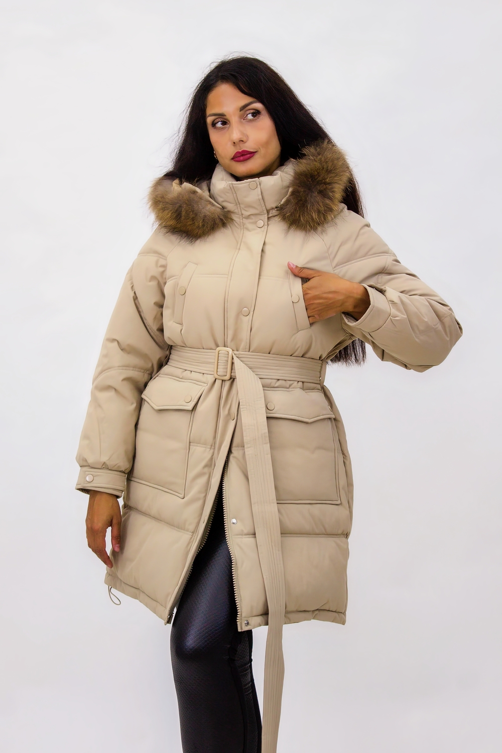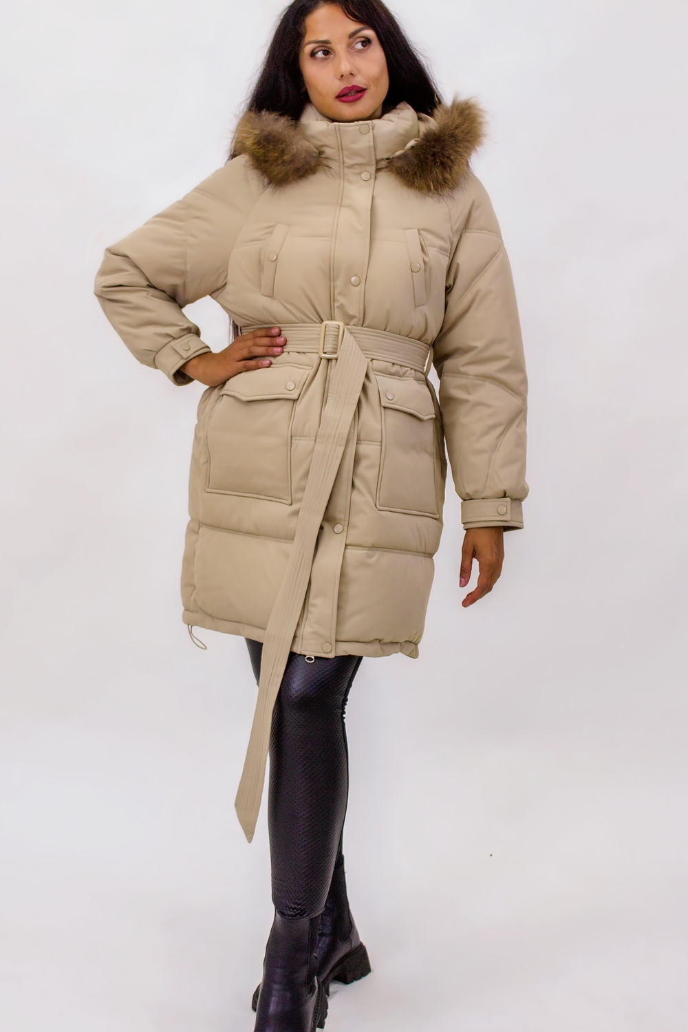 Зимняя куртка на поясе с натуральным мехом арт. 23226