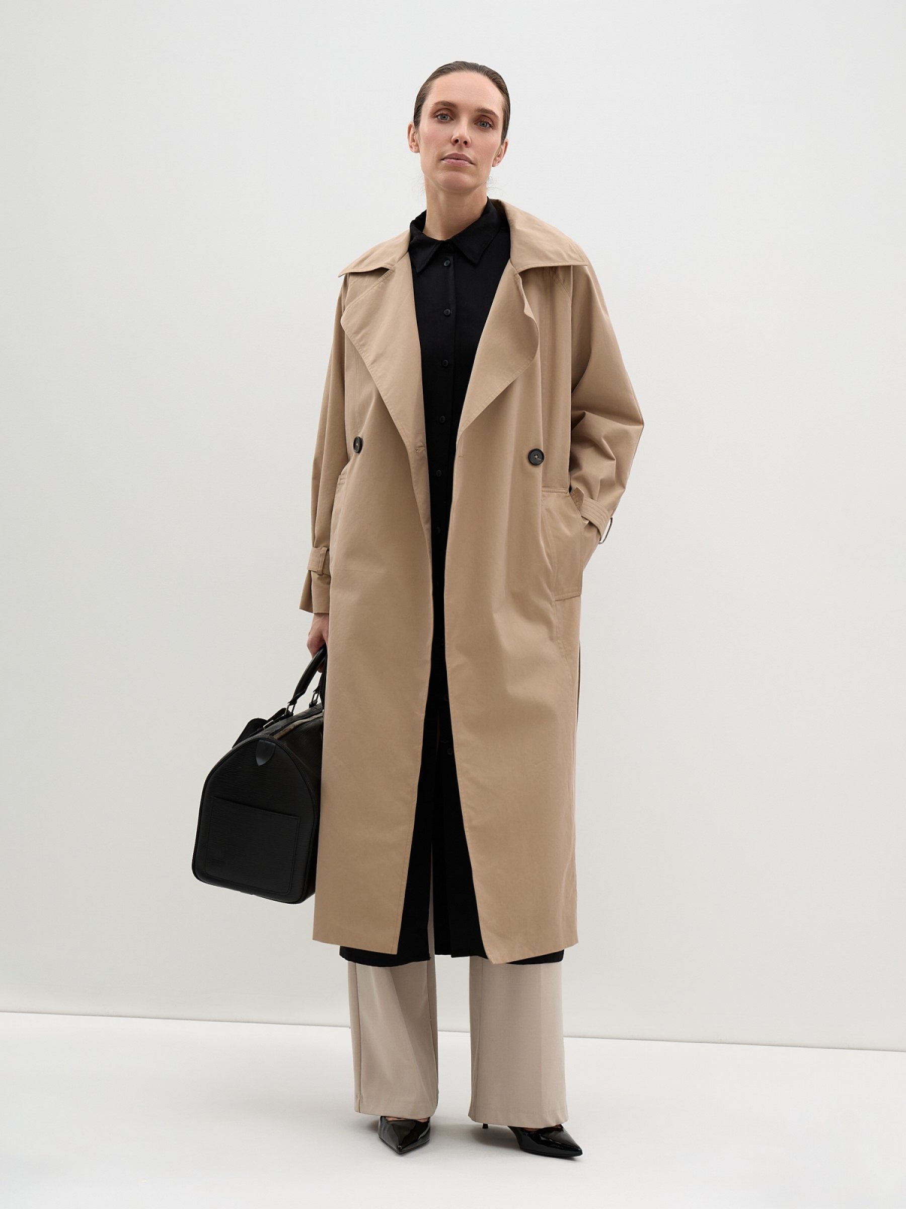Классический двубортный тренч – базовый вариант для теплого демисезона и лета. Сконструирован для красивой посадки на любую фигуру: с высокой встречной складкой на задней кокетке, рукавами реглан и в правильной длине миди. Пояс и паты на рукавах с контрастными пряжками локально регулируют объемы, а вкупе с английским воротником статусно усложняют визуал изделия. Плотная хлопковая ткань согревает и позволяет телу дышать. Шелковистая подкладка в тон. верх: 65% хлопок, 35% полиэстер; подклад: 100% полиэстер